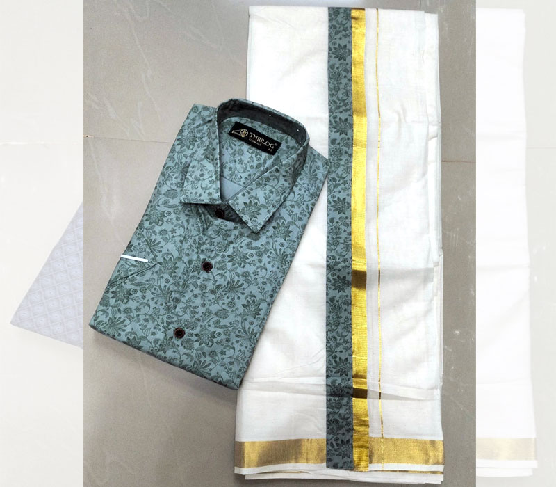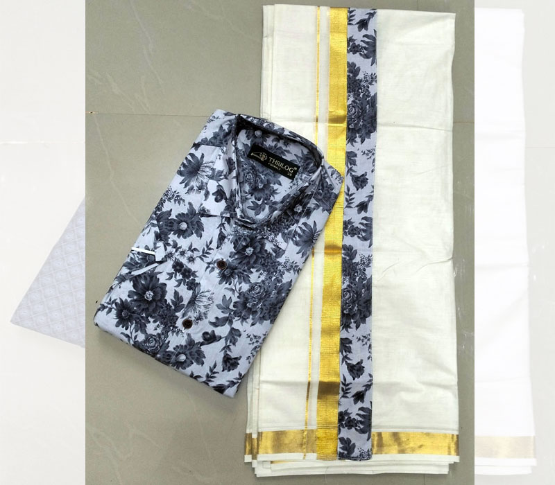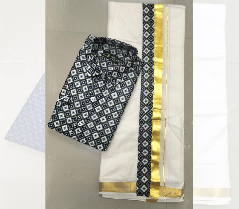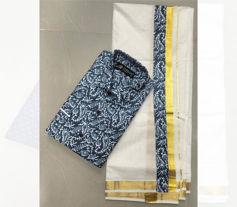Ajrak cotton half sleeve shirt with Dhothi set for men.
