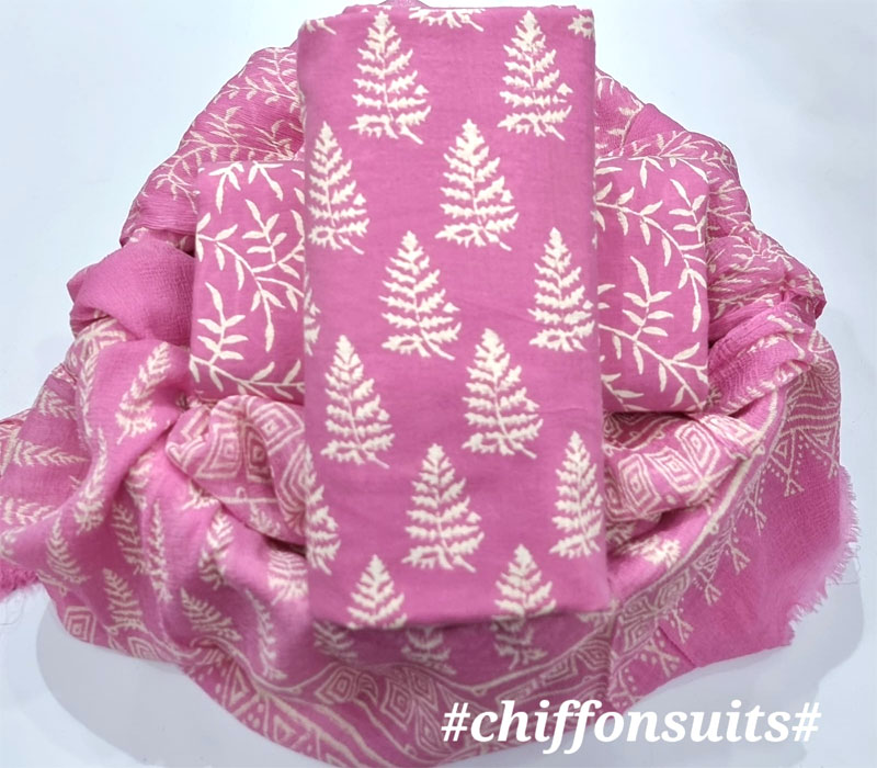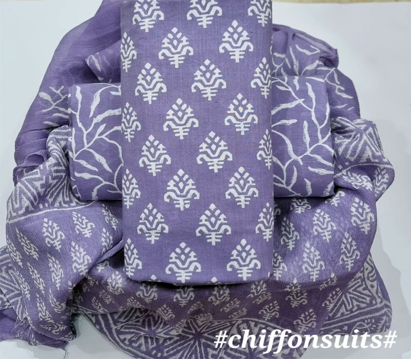 Hand block printed cotton dress materials with chiffon duptta. Top cotton:2.50m, dupatta chiffon: 2.50m, bottom cotton: 2.50m.