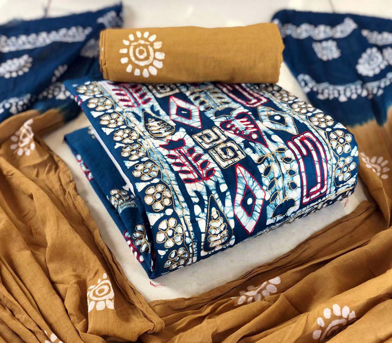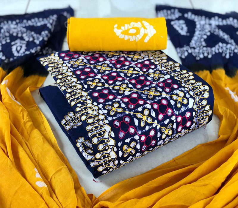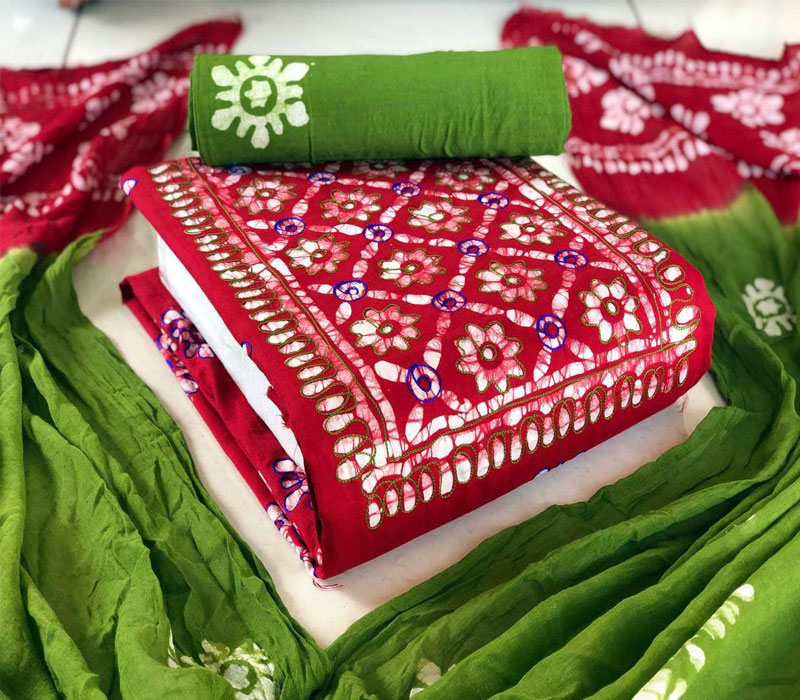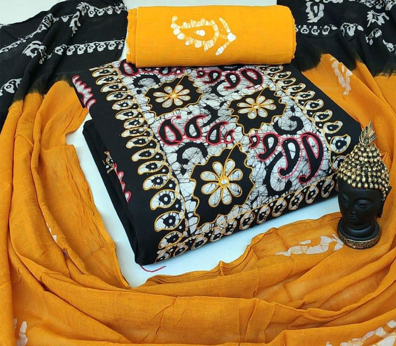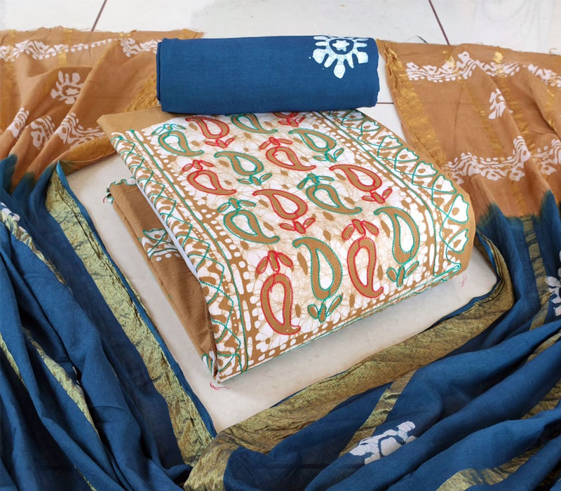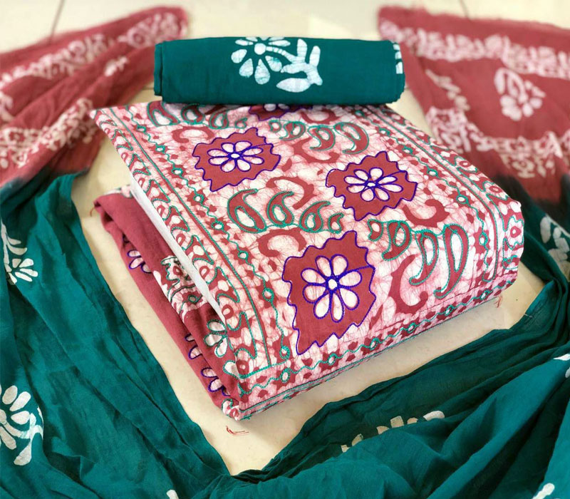 Fabrics: Hand Block Pure Wax Batik Cotton With Neck Embroidery Work 2.50mt top and hand wax Batik Cotton 2.00mt bottom with full wax. Batik 2.50mt. Cotton Mal Mal Resham Patti Border Dupatta.