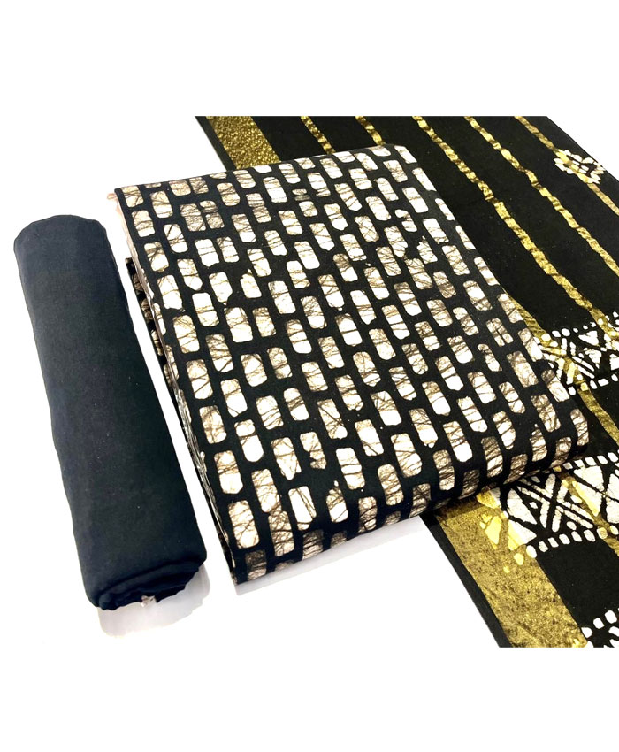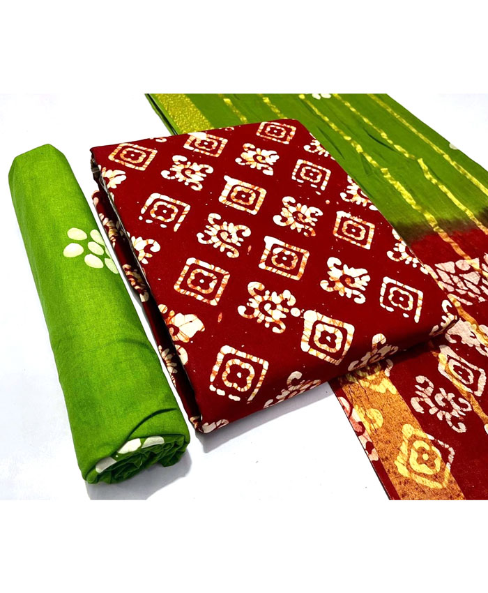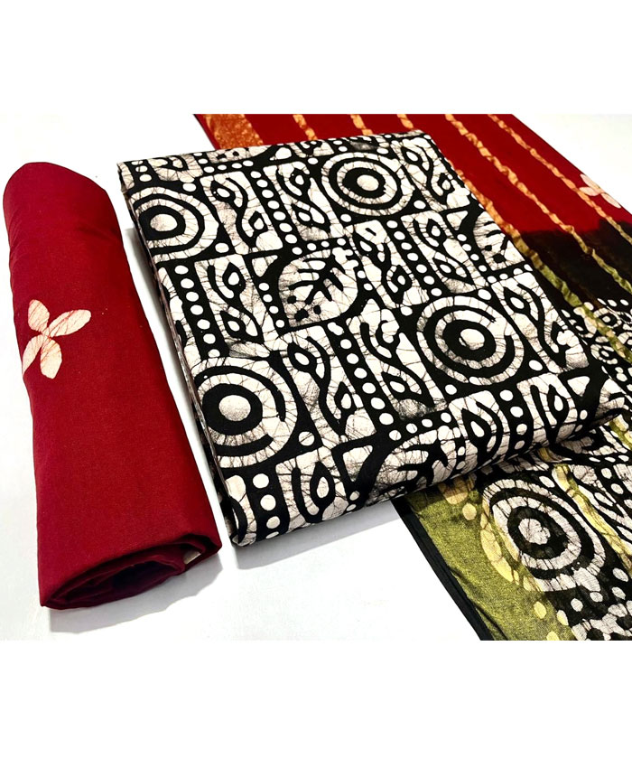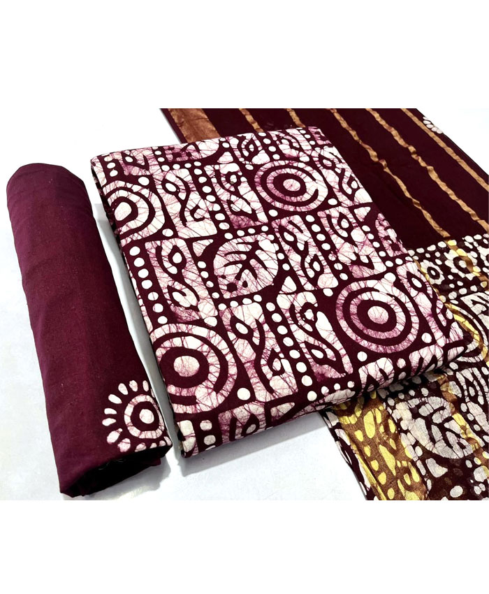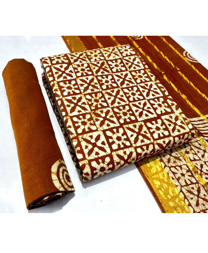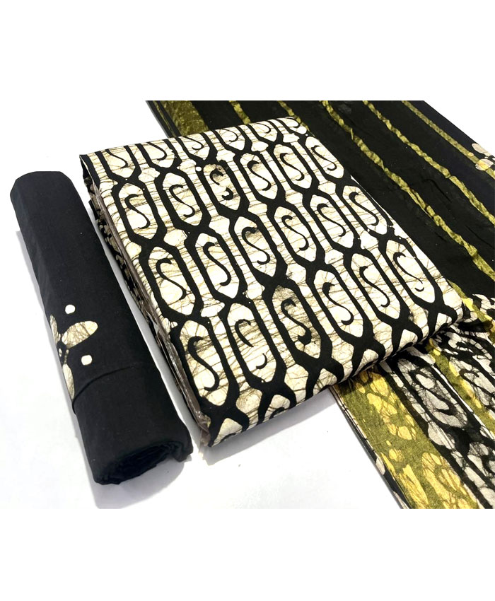 Fabrics: Multi Wax Batik Cotton 2.50 Meter Top. Pure Cotton Gulti Bandhej 2.00 Meter Bottom. Pure Cotton Gulti Bandhej Resham Lining Border 2.50 Meter Dupatta with 150 Gsm Heavy Quality. Regal Blue Yellow White Colour.
