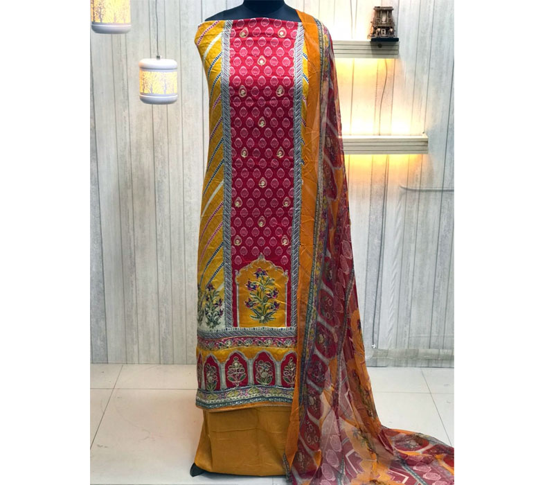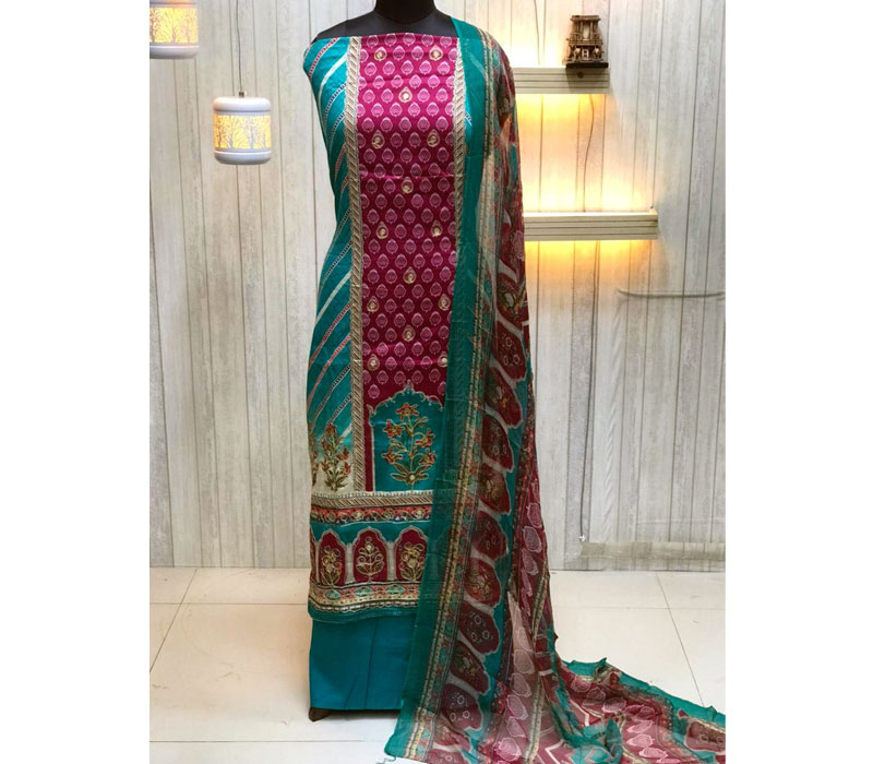Top: Jam Satin Discharge Print with Handwork and Swaroski Dress Material. Size: 2.5 meter, Bottom: Pure Viscos santoon, size: 2.8 meter, Dupata: Pure bemberg digital style print