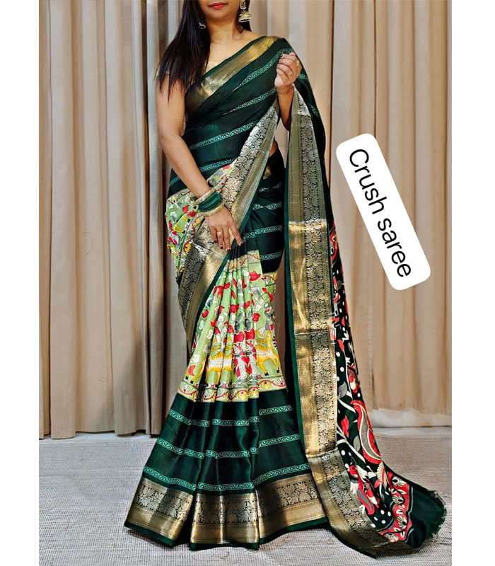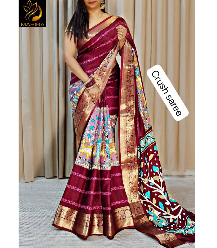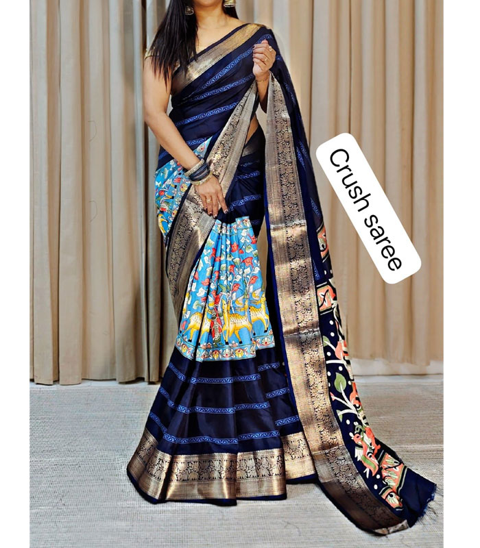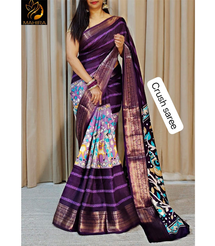 Immerse yourself in tradition and elegance with our exquisite Soft Dola Crush Saree. This stunning piece features a captivating Kalamkari pattern intricately woven into the center, creating a rich visual narrative. The saree is beautifully framed by a sophisticated weaving border, leading to a truly grand Kalamkari pallu that makes a magnificent statement. Perfect for any special occasion, this saree promises both luxurious comfort and timeless style.
