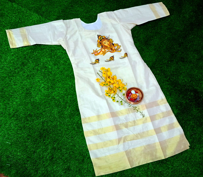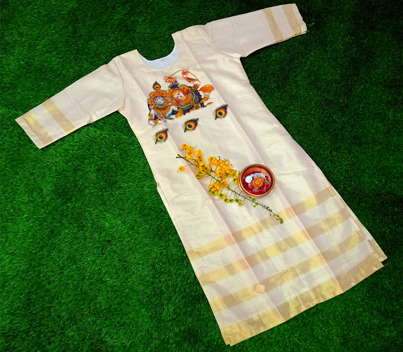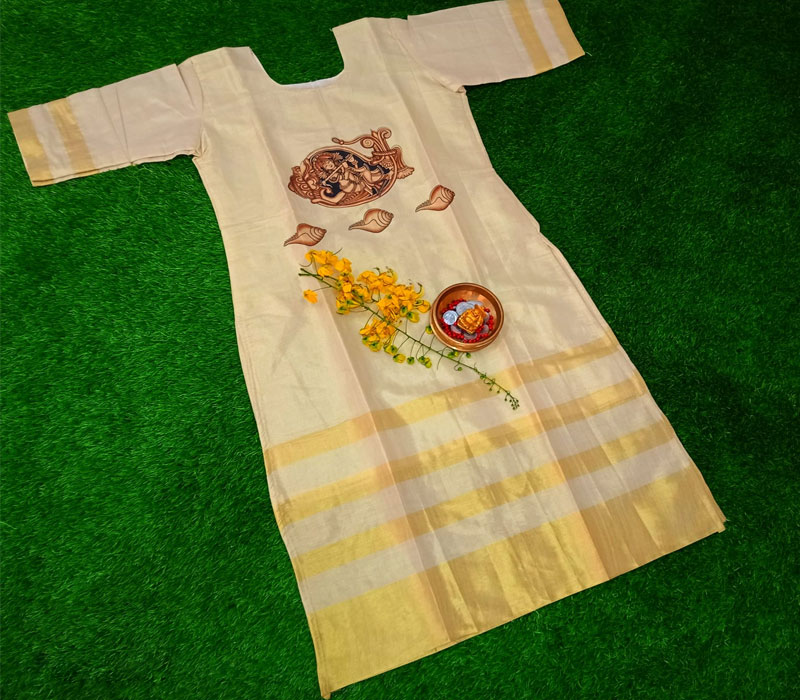 Golden stripes tissue kurthi with mural print with cotton lining. Kurthi + shall + pant 2 mtr material