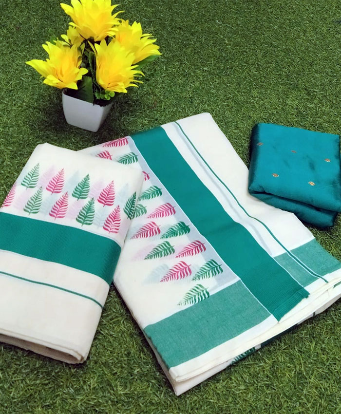 Printed Cotton Set Mundu with Blue Border and Leaf Design
