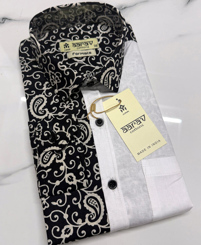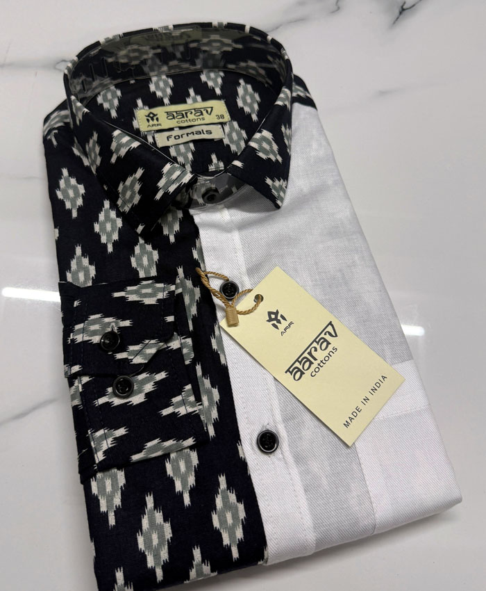 Step out in distinctive style with our Full Sleeves Ajrakh Shirt, featuring a captivating two-tone design. This shirt boasts rich Ajrakh patterns covering two-thirds of the fabric, complemented by a contrasting white section on the remaining one-third. Crafted for comfort and a refined look, this full-sleeved shirt is a versatile addition to any discerning wardrobe.