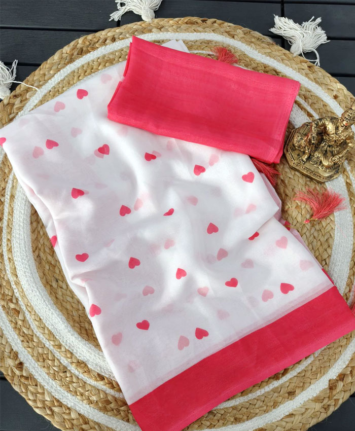 Experience the blend of luxury and playful design with our Luxurious Star Georgette Saree. This premium fabric offers a beautiful drape, adorned with an enchanting heart print throughout the saree. A finely detailed viscose weaving border frames the design, adding a touch of artisanal craftsmanship. Complete with a coordinating blouse piece and pallu, this saree is a versatile choice that's perfect for any occasion, ensuring you look effortlessly graceful.