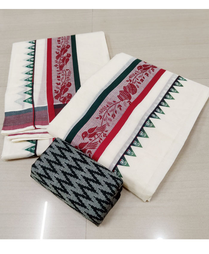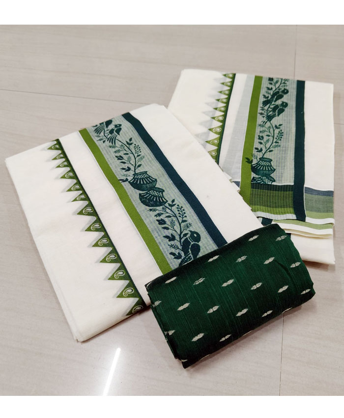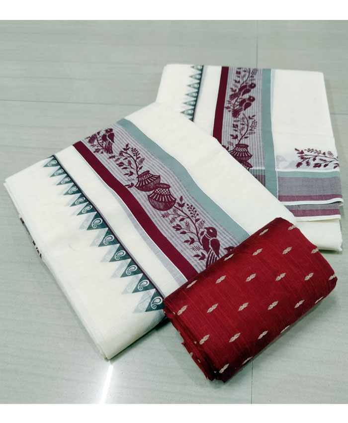 Embrace the timeless elegance of Kerala with our Traditional Cotton Set Mundu. This classic setmundu is beautifully adorned with rich colours, featuring intricate floral and birds motifs. The breathable cotton fabric ensures comfort, while the traditional design makes it a perfect choice for festivals, temple visits, and cultural events. The set is completed with a unique, contrasting geometric-print blouse piece, adding a modern touch to the traditional ensemble.
