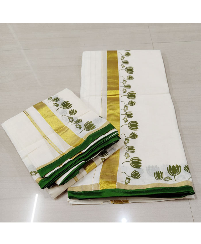 Drape yourself in the serene beauty of our Elegant Lotus Print Set Mundu. This traditional set mundu features a delicate and beautiful lotus print that adorns the border, adding a touch of floral charm. The set mundu is further enhanced with subtle pipping detail, giving it a refined and polished look. It is paired with a lightweight slub blouse piece with light kasavu, which provides a beautiful texture and a touch of golden shimmer. This set is a perfect blend of tradition and modern elegance, ideal for festivals, temple visits, and special occasions.