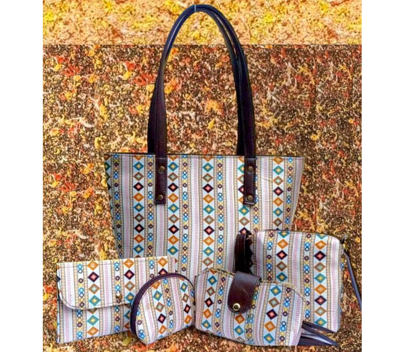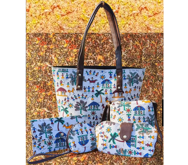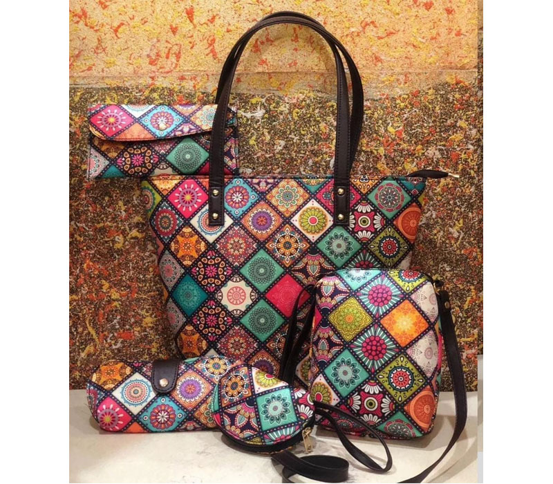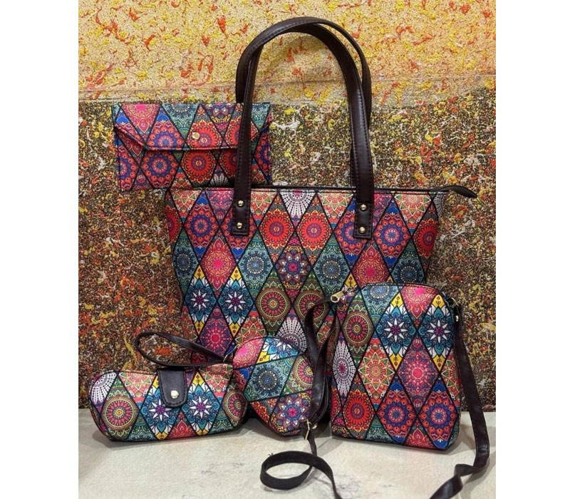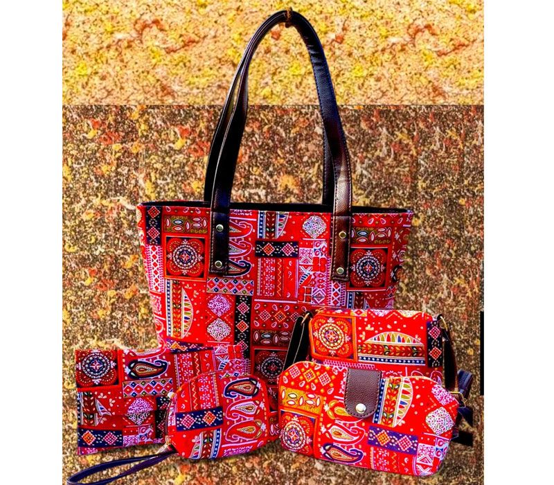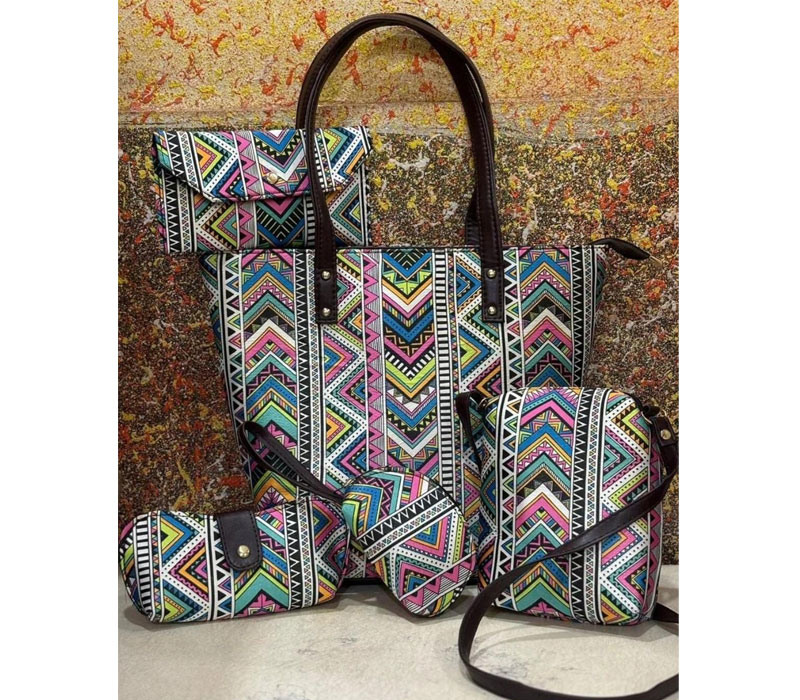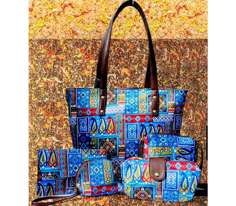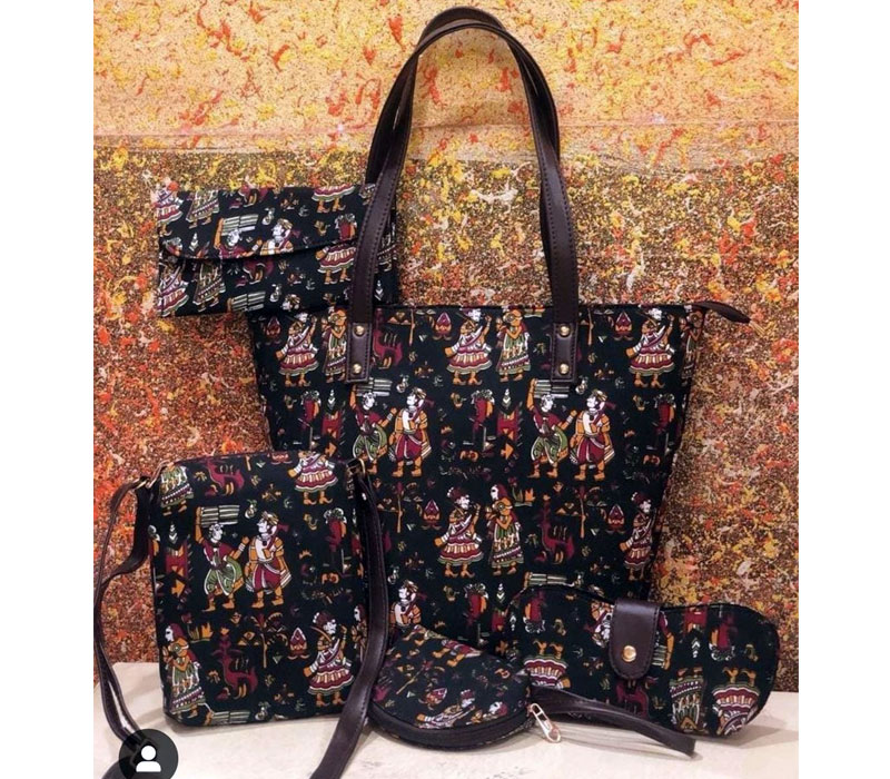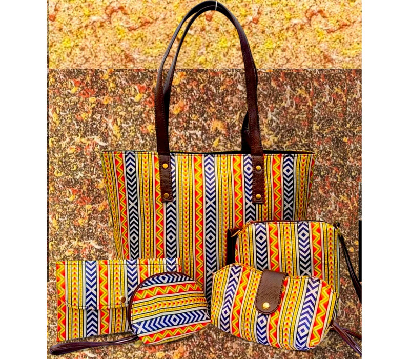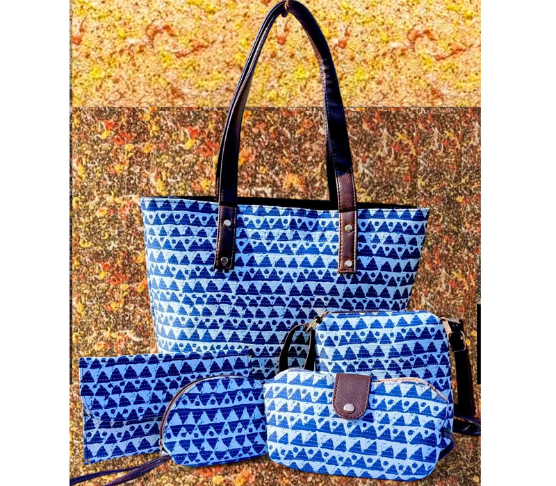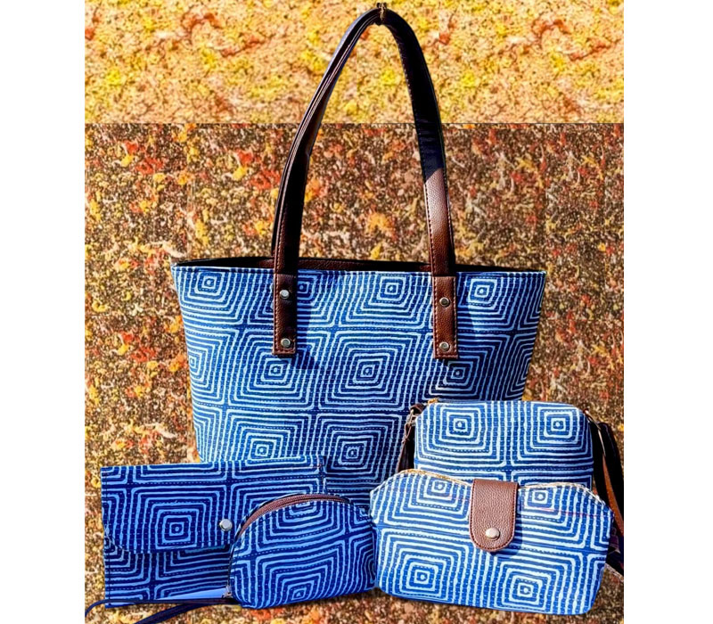 Stylish and unique Ikkat Tote bag combo for women. One Tote bag with size of 15 × 12 inces, one Coin Pouch with size of 6 × 4.5 inches, one Hand Wallet with size of 8.5 × 5.5 inches, one Sling bag with size of 7.5 × 8 inches, one Goggle Pouch with size of 8.5 × 4.5 inches.