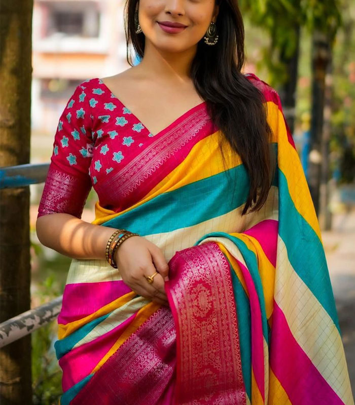 Introducing our New Single Color Edition Cotton Chex Saree, a perfect blend of tradition and contemporary style. This soft cotton crape saree features elegant zari woven chex patterns complemented by a rich pattu border. Adding a modern touch are the multi-colored strips printing that run throughout, while charming cotton tassels adorn the pallu. The ensemble is completed with a matching running chex blouse featuring delicate butti printing, ensuring a cohesive and sophisticated look.