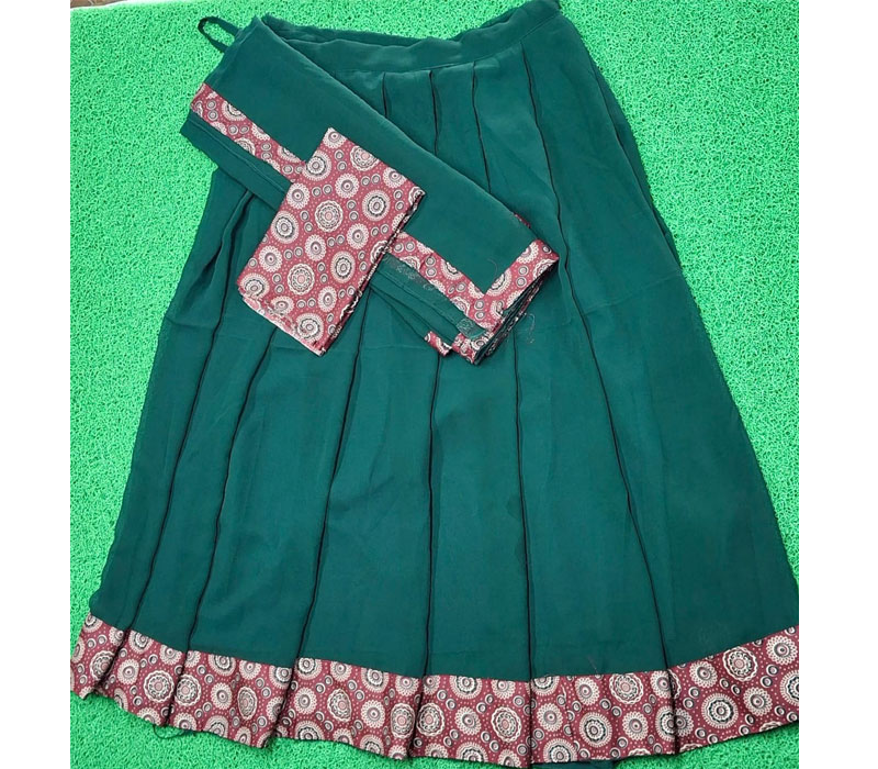 Elevate your wardrobe with our exquisite Georgette Ajarkh Combination Dhavani Set. This stunning ensemble features a beautiful Ajarkh design that perfectly complements the luxurious georgette fabric. Skirt: 4 meters, stitched Shawl: 2.60 meters Blouse: 1 meter, unstitched Perfect for any occasion, this set combines traditional elegance with modern style.