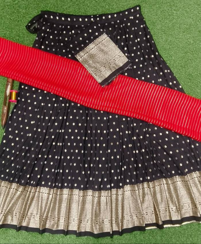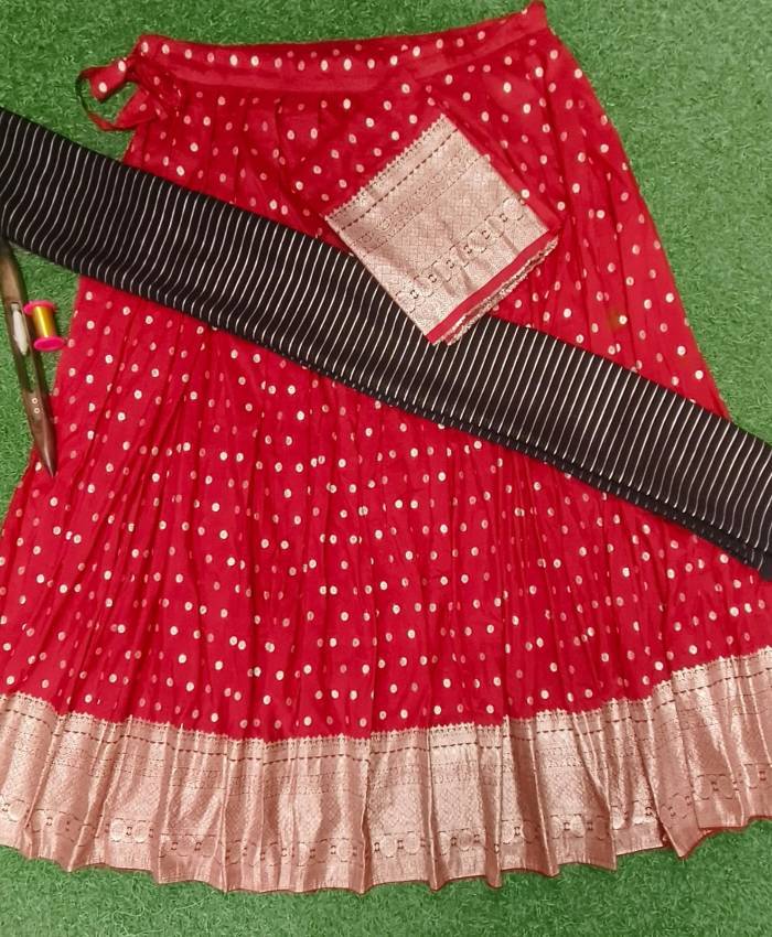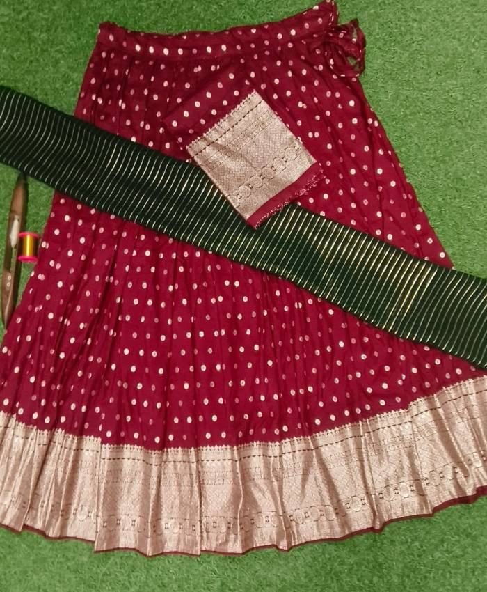 Embrace the rich cultural heritage of Kerala with our Vibrant Kerala Traditional Dhavani Set. This stunning ensemble features a captivating vibrant colours, the skirt (pavada) adorned with elegant silver/cream polka dots and a matching intricate border. It is beautifully complemented by contrasting colours of dupatta/half-saree with subtle stripes, adding a fresh and striking appeal. The set also includes a coordinating blouse piece with matching border work. Perfect for festive occasions, cultural events, or traditional celebrations, this Dhavani set offers a blend of classic charm and vibrant modern style. Length 40.42, Blouse 1. Mtr.
