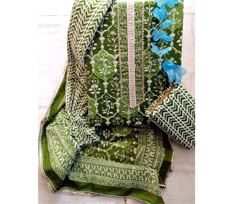 Sanganeri print cotton suit material with cotton dupatta. Gotta tye neck work. Top cotton 2.5m. Bottom cotton 2.5m. Duppta cotton 2.5 m.