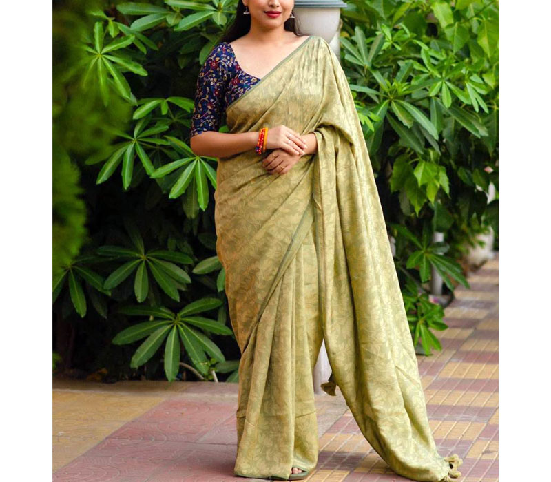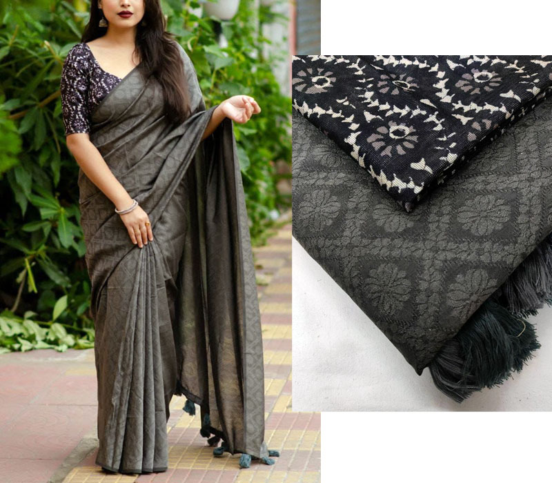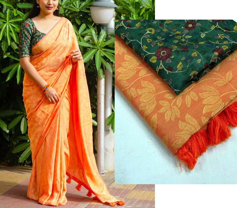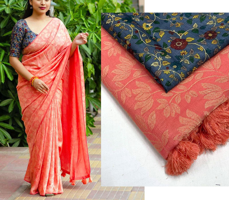 Soft silk material full jacquard saree with blouse. Saree: 5.5mt, blouse 1 mtrs, Quality: premium. Material:soft silk self woven designed jacquard saree. Cotton tassel on pallu. Blouse- kalamkari style printed jute silk blouse.