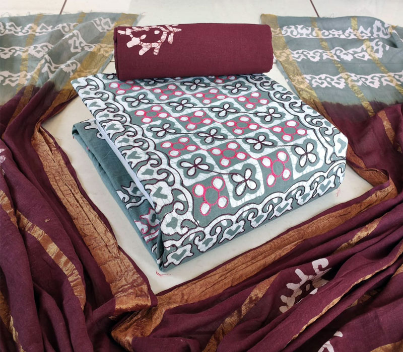 Unstitched Wax Batik Work Suits. Fabrics: Hand Block Pure Wax Batik Cotton With Neck Embroidery Work 2.50mt top and hand wax Batik Cotton 2.00mt bottom with full wax. Batik 2.50mt. Cotton Mal Mal Resham Patti Border Dupatta.