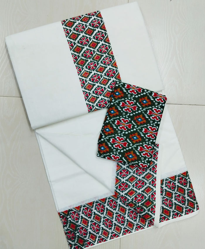 A comfortable and elegant Gada cotton saree with a vibrant print on the pallu and border. This saree comes with a striking, contrastingly printed blouse piece, making it a complete and stylish outfit.