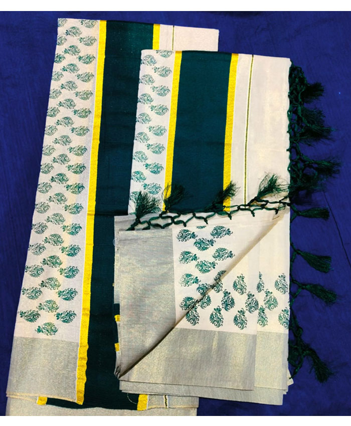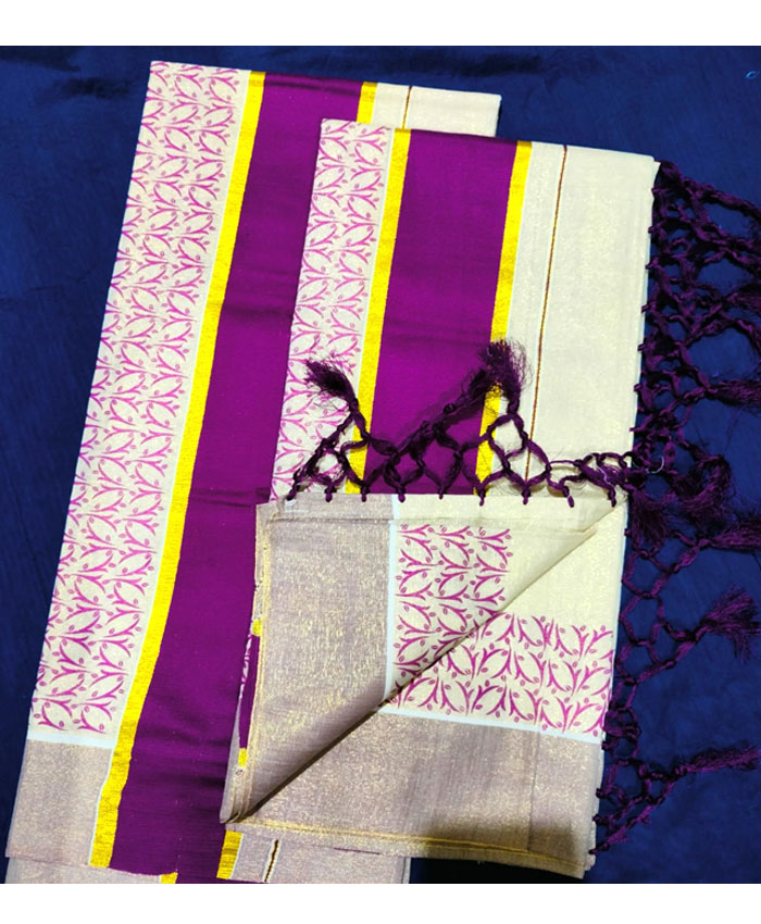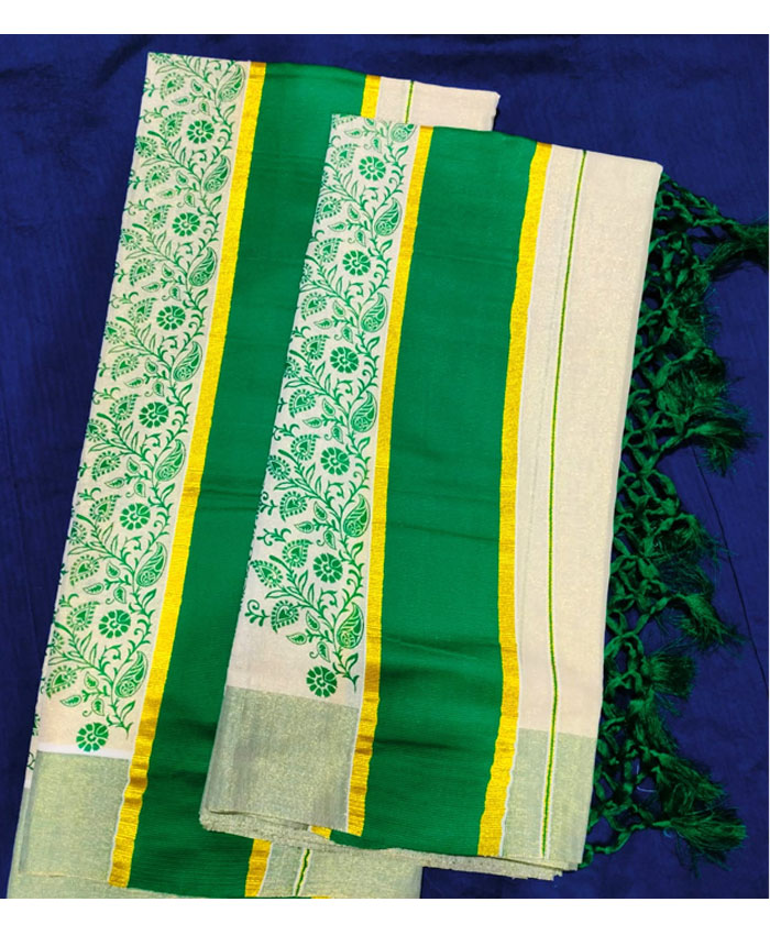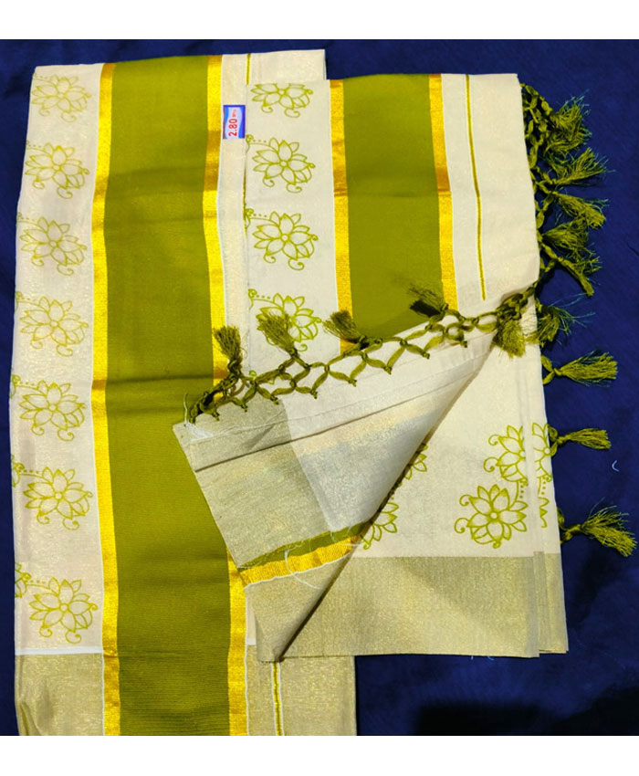 Printed Tissue Set Mundu with Colour Border. Length:2.80mtr.
