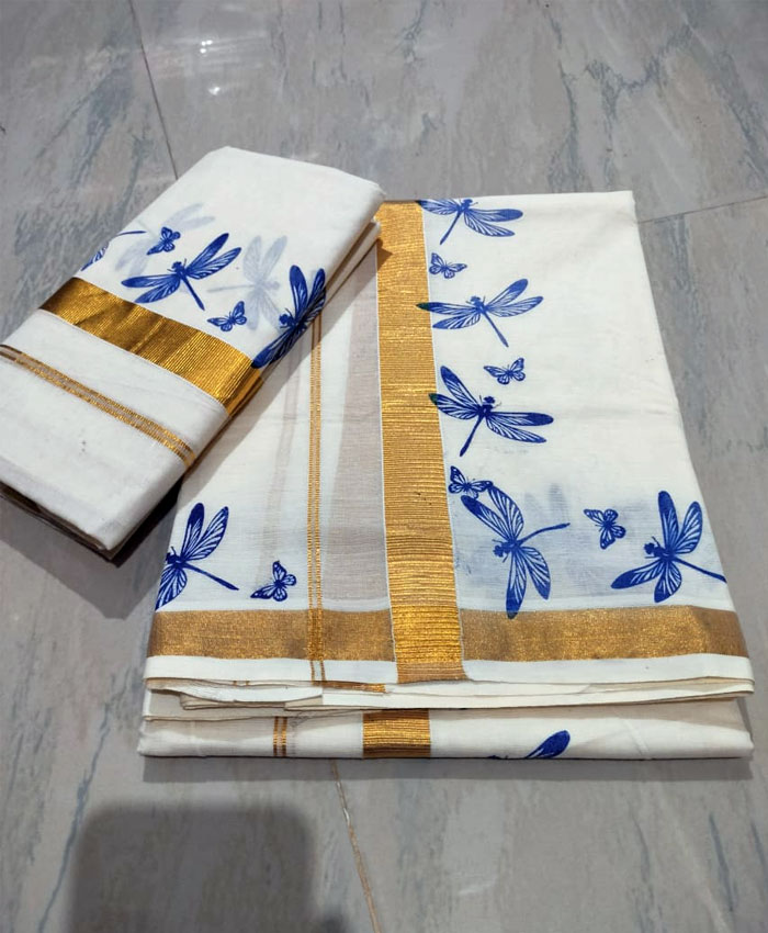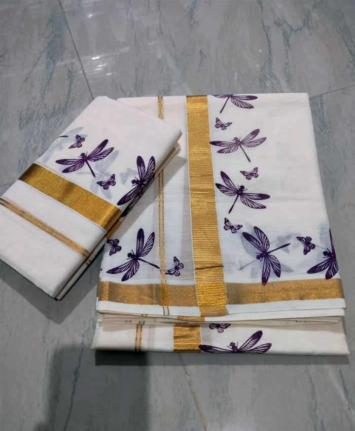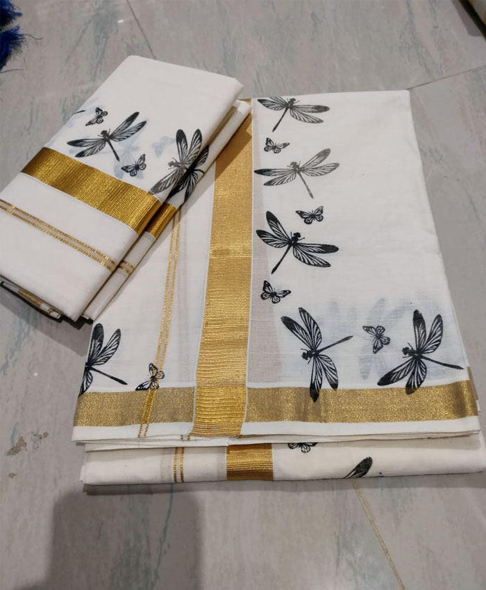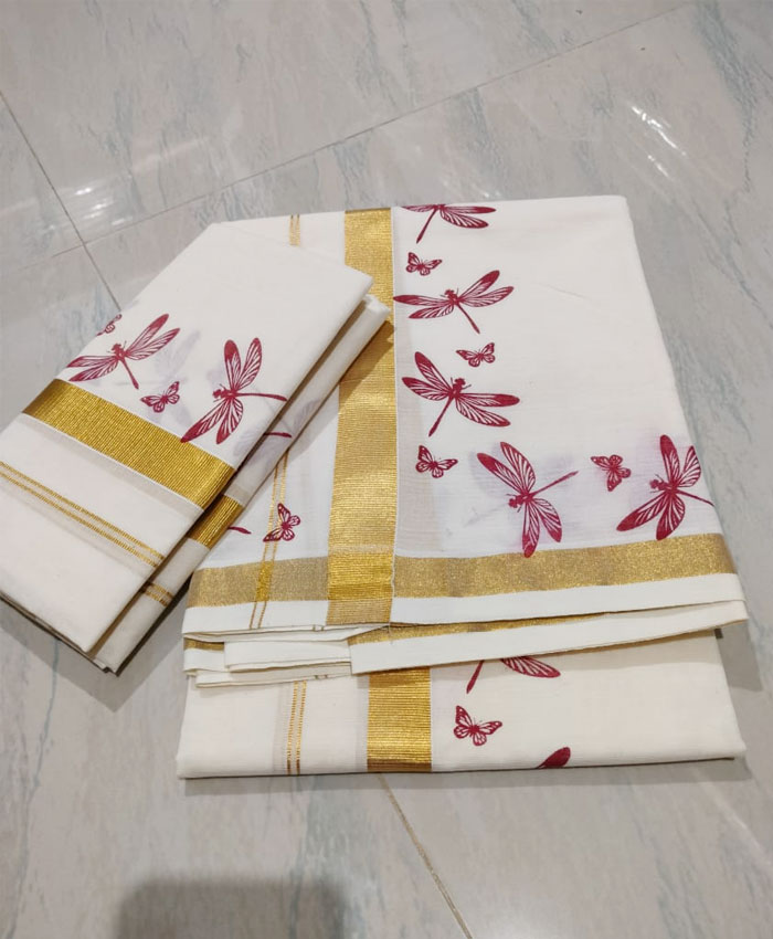 This exquisite, premium-quality cotton setmund features a classic off-white body with a delicate light kasavu border, giving it a traditional and elegant appeal. The standout feature is the intricate and charming design of red dragonflies and butterflies that are gracefully scattered across the fabric. The lightweight and breathable cotton ensures superior comfort, making it a perfect choice for festive occasions and traditional celebrations.