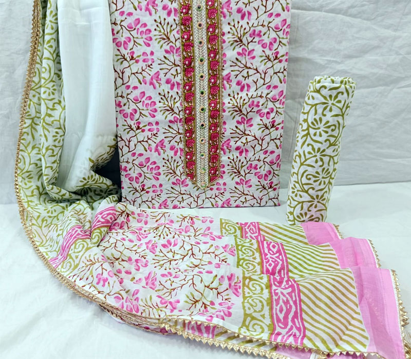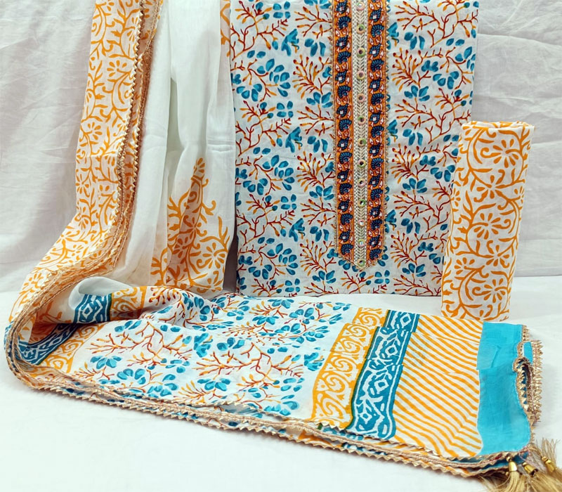 Sanganeri print cotton suit material with cotton dupatta. Gotta tye neck work. Top cotton 2.5m. Bottom cotton 2.5m. Duppta cotton 2.5 m.