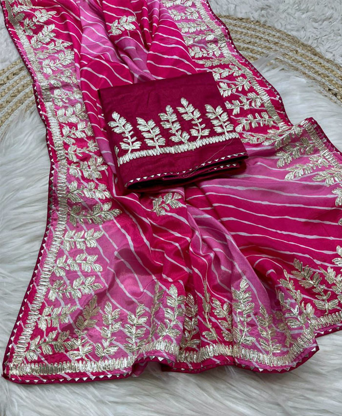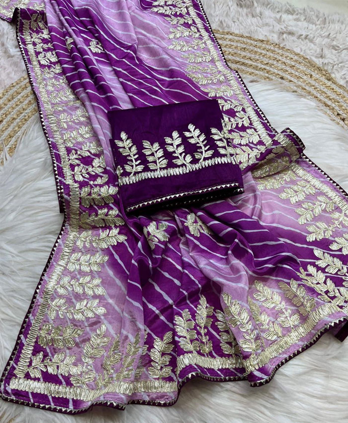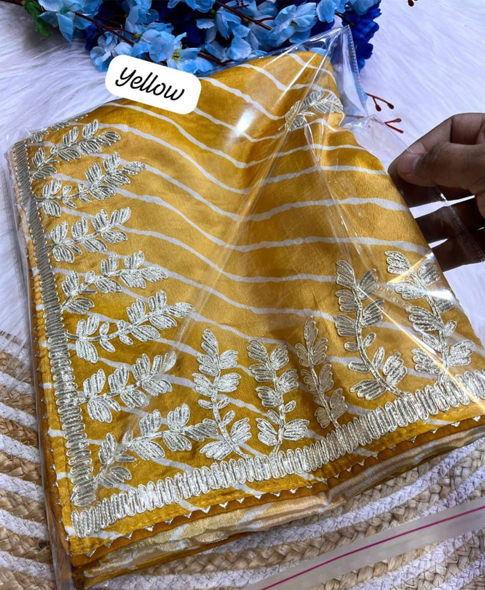 Drape yourself in the vibrant elegance of our beautiful Soft Chinon Silk Lehriya Multi Saree. This stunning piece features a mesmerizing lehriya multi-color design that flows gracefully. The heavy pallu is adorned with intricate ribbon and gota work, while delicate butti work is sprinkled throughout the entire saree, adding a touch of traditional charm. It comes with an unstitched heavy mono blouse featuring complementary work, allowing for a custom fit.