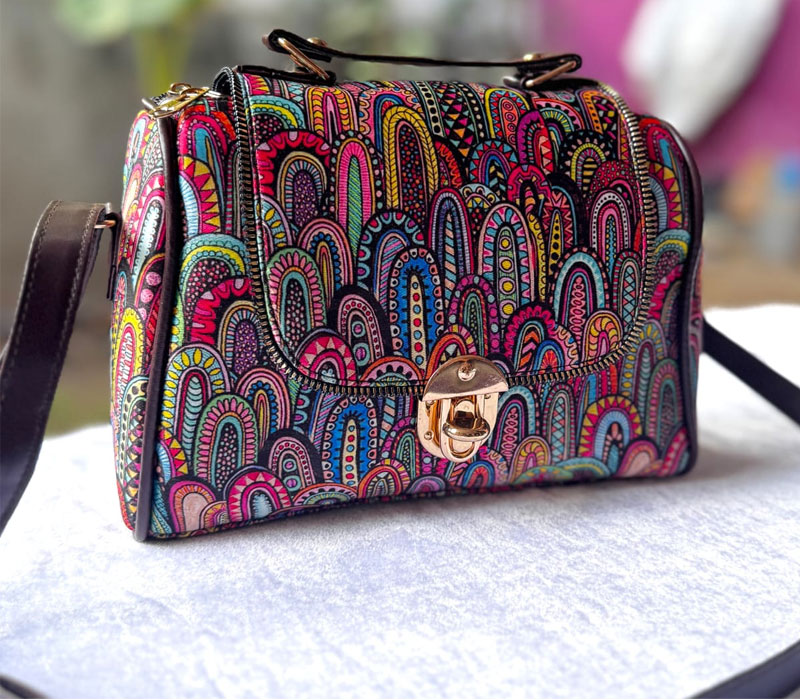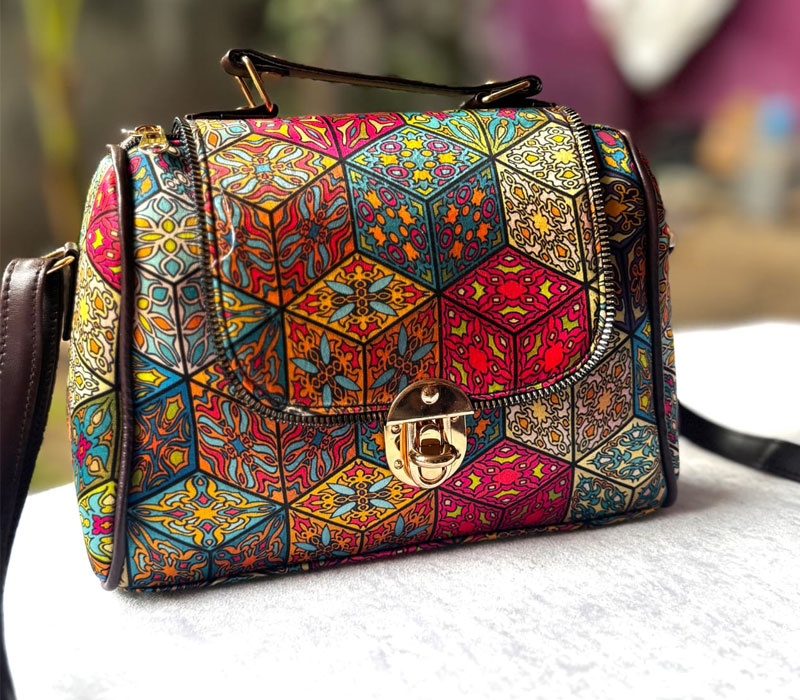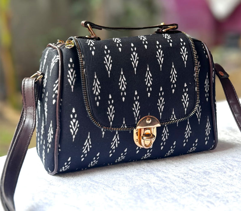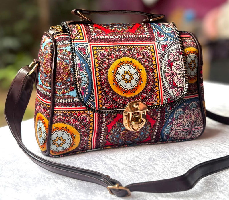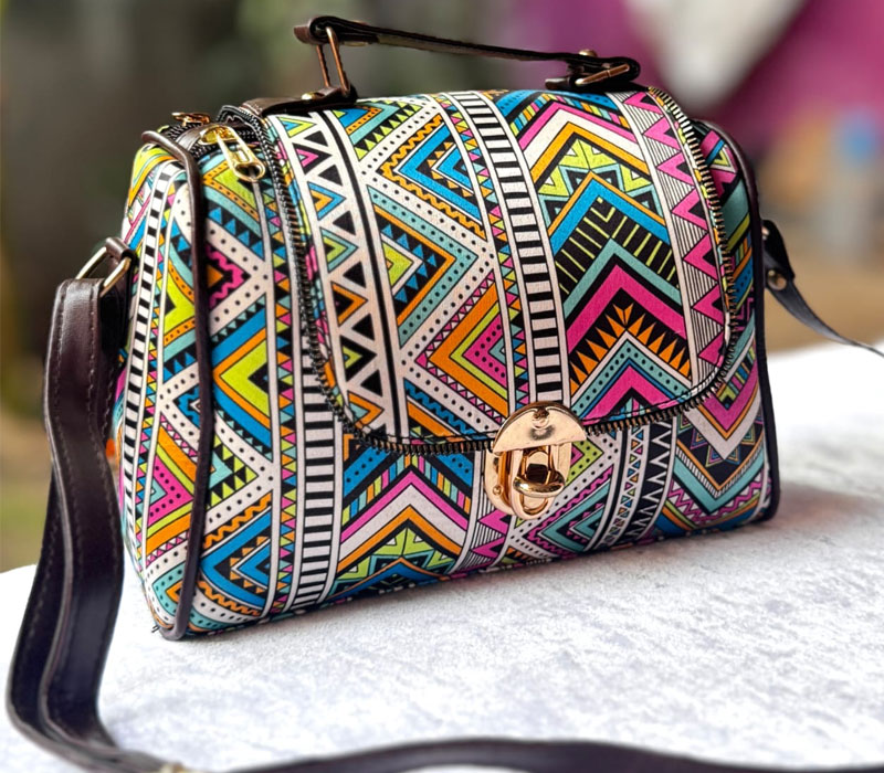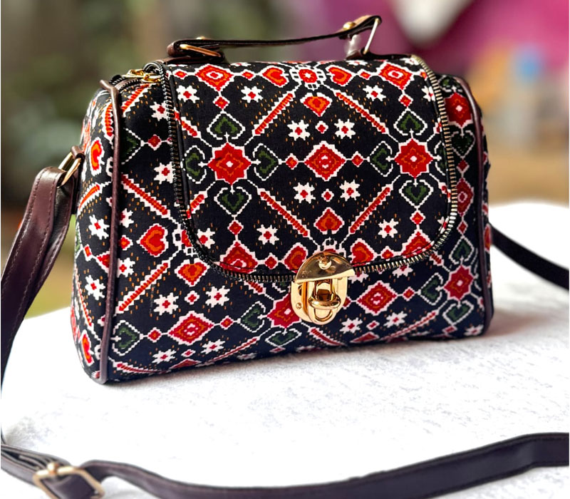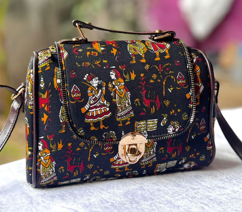 Beautiful Ikkat fabric Double partition one inside pocket and one back side pocket sling bag with adjustable belt. Size: 9.5 x 7.5 inches.