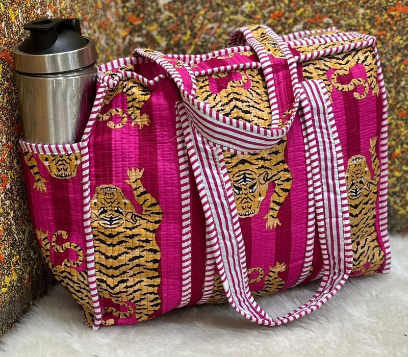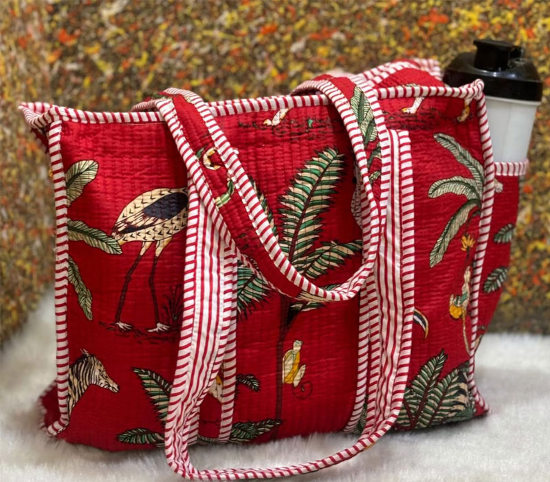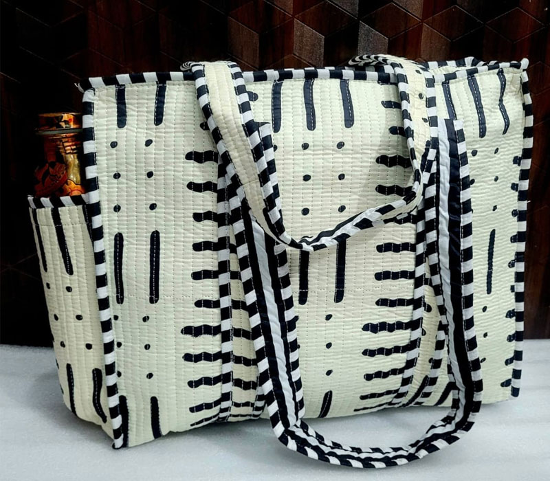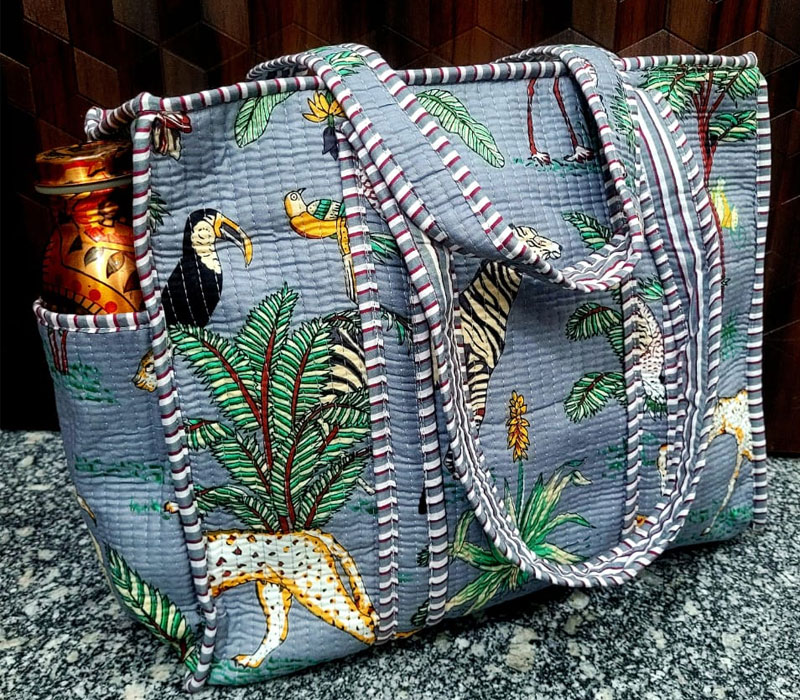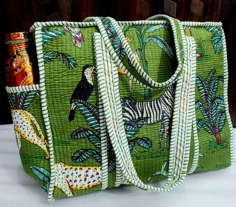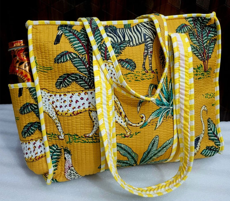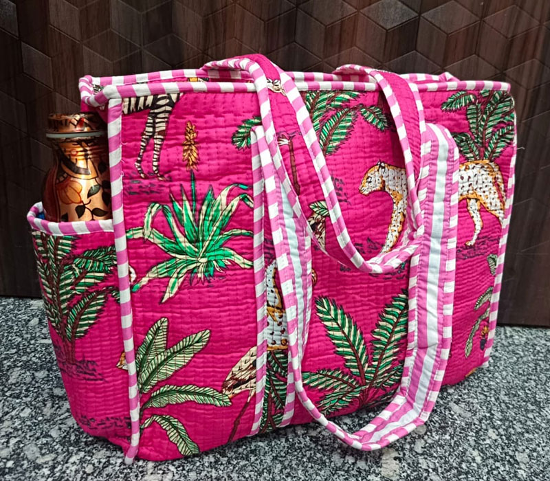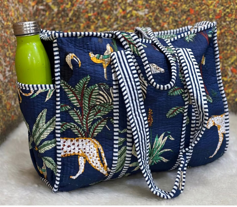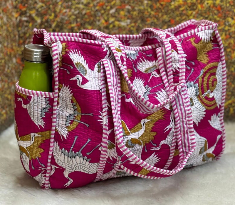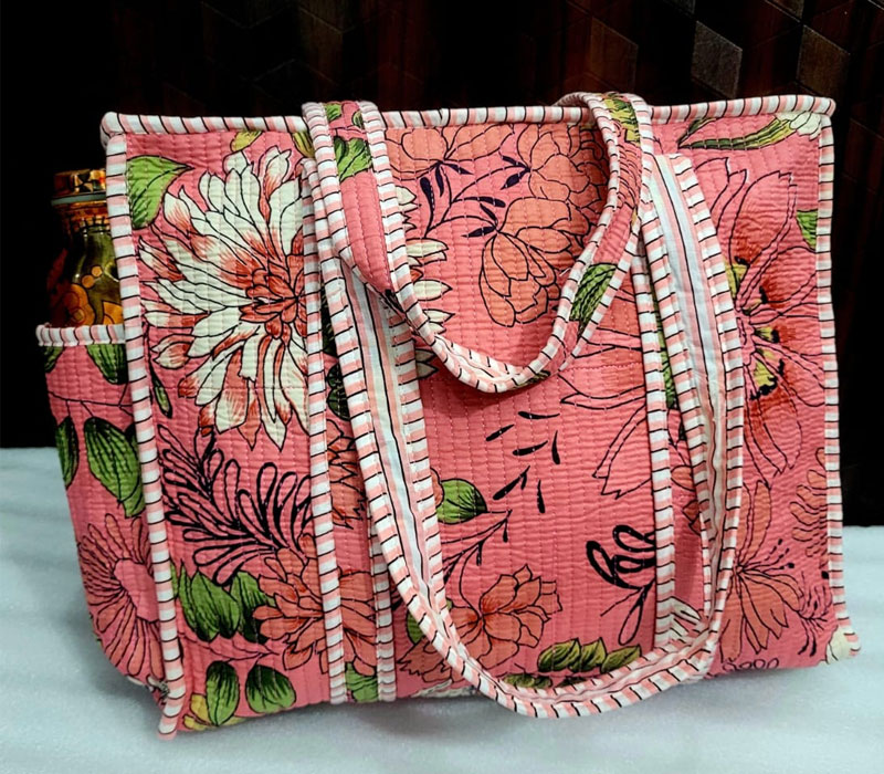 Weight less and easy to carry tote style washable cotton quilted Jhola bag with external bottle pocket as bottle Pouch. Hand and machine washable and both sides are printed. Size 16 x 16