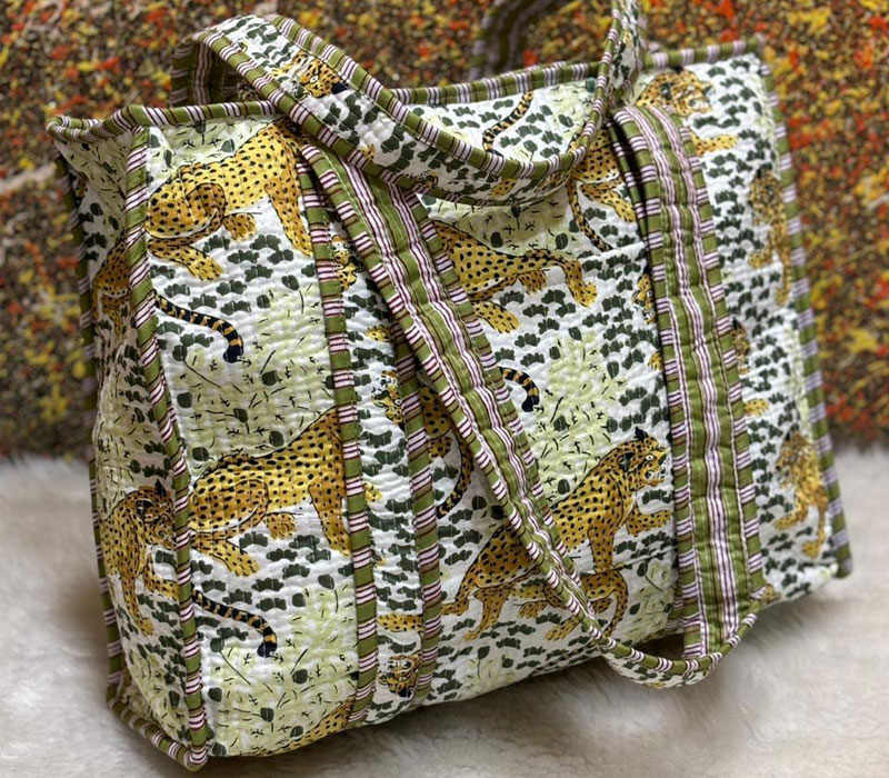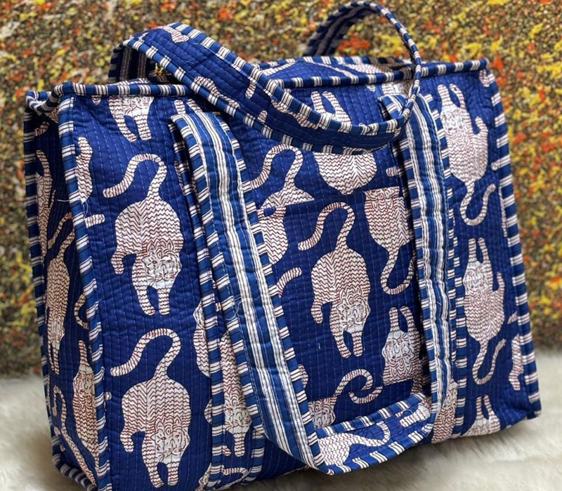 Weight less and easy to carry tote style washable cotton quilted Jhola bag without bottle Pouch. Hand and machine washable and both sides are printed. Size 16 x 16