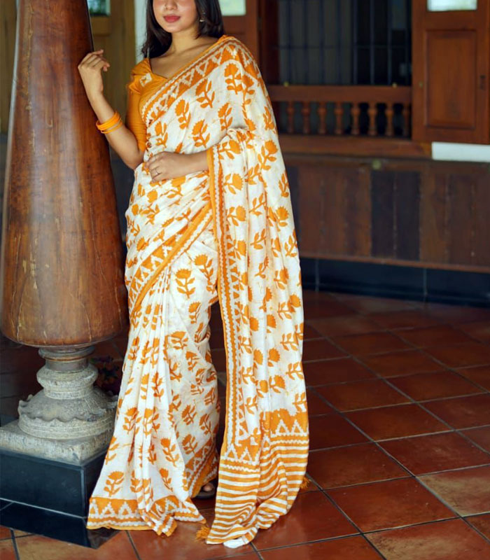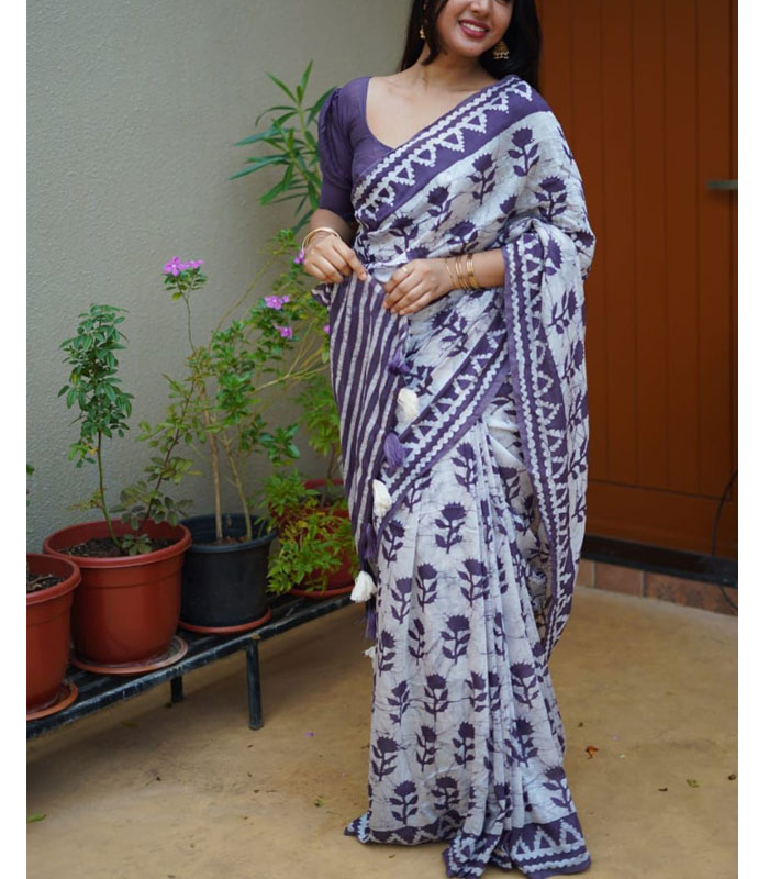 Drape yourself in the serene beauty of our Soft Pure Chanderi Cotton Saree, showcasing exquisite hand block Batik rose prints that evoke a sense of timeless artistry. The pallu is elegantly finished with charming cotton tassels, adding a touch of traditional grace. This beautiful saree comes complete with a running blouse made from matching hand block printed Chanderi cotton, ensuring a cohesive and sophisticated ensemble perfect for any occasion. - Saree length: 5.5 meters - Blouse length: 1 meter