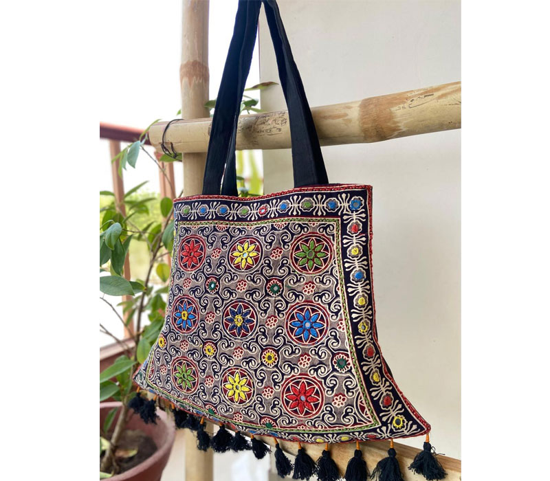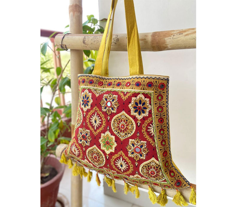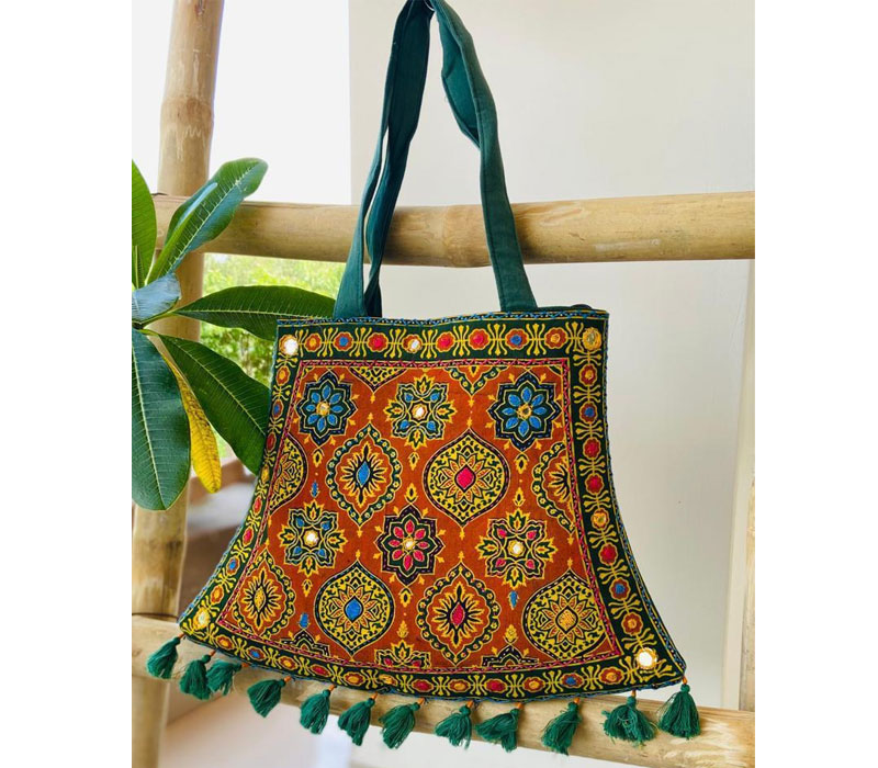 Stylish Ajrakh type handbag with hand embroidery and mirror works with inside pockets and zip closure. Size: 15 x 16 inches