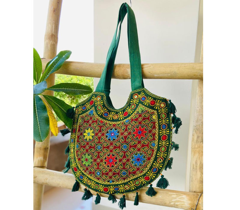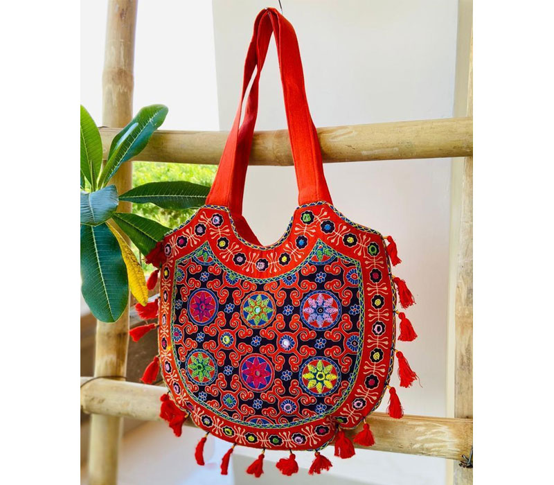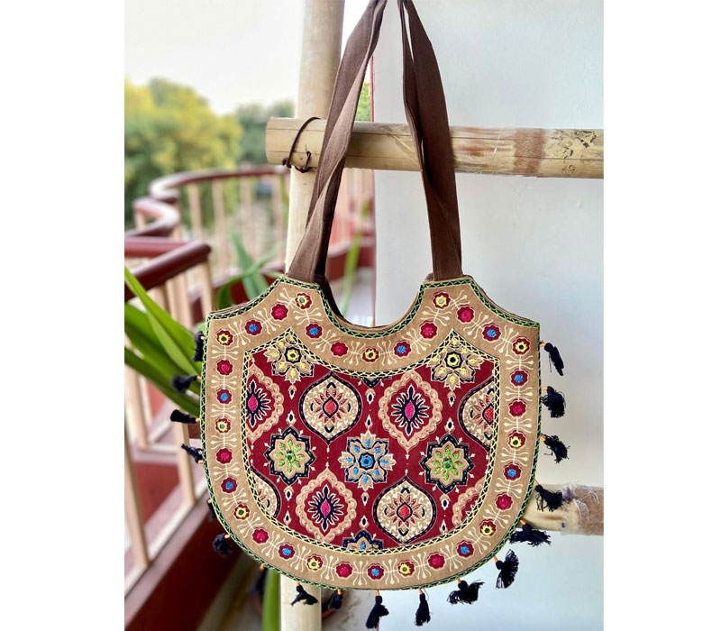 Stylish Ajrakh type handbag with hand embroidery and mirror works with inside pockets and zip closure. Size: 15 x 16 inches