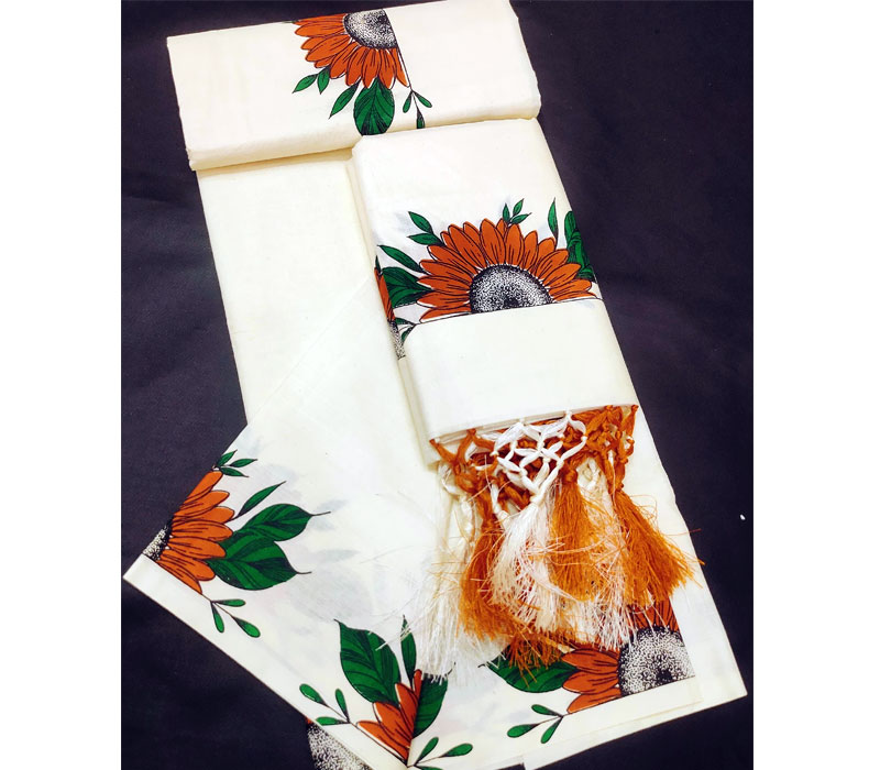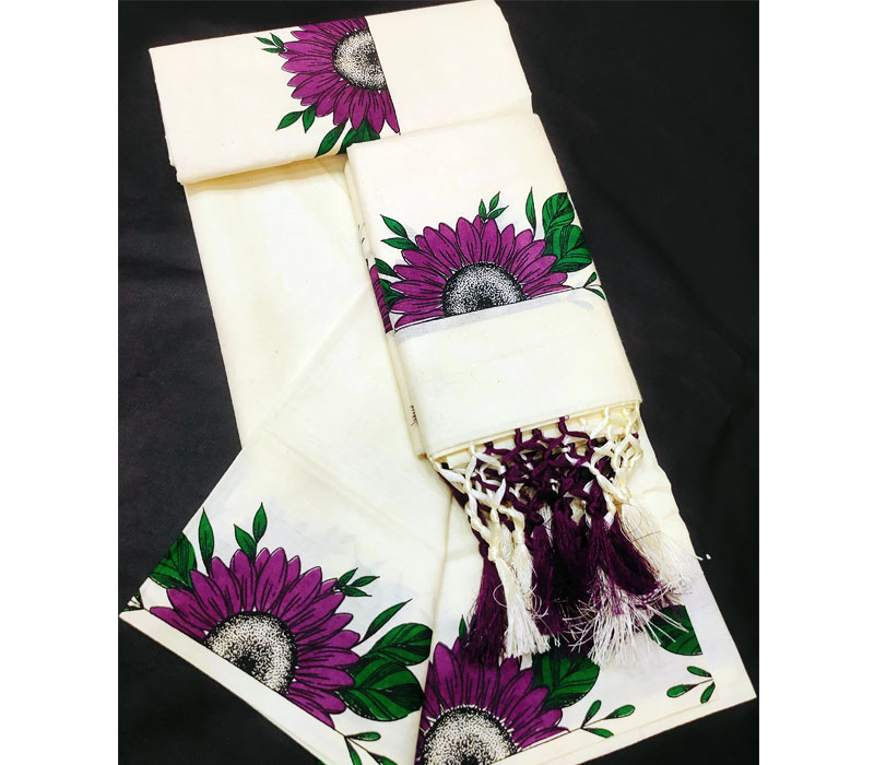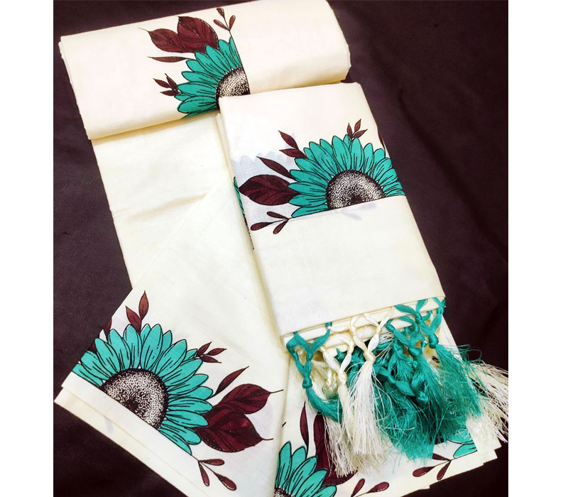 Kerala traditional tissue saree with mural print with sunflower design. Length 6.25 mtr