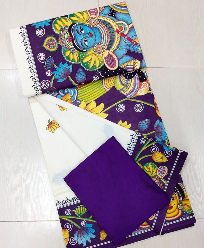 Drape yourself in a masterpiece of devotion and art with our Divine Cotton Saree. Crafted from soft and breathable cotton material, this saree offers exceptional comfort and a graceful drape. The highlight is its stunning Lord Krishna mural print, beautifully rendered with vibrant colors on a rich green and white background, bringing a captivating narrative to your attire. The set includes a matching plain green blouse piece, creating a cohesive and striking traditional ensemble. Perfect for festive occasions, temple visits, or any event where you wish to exude cultural grace and artistic flair.