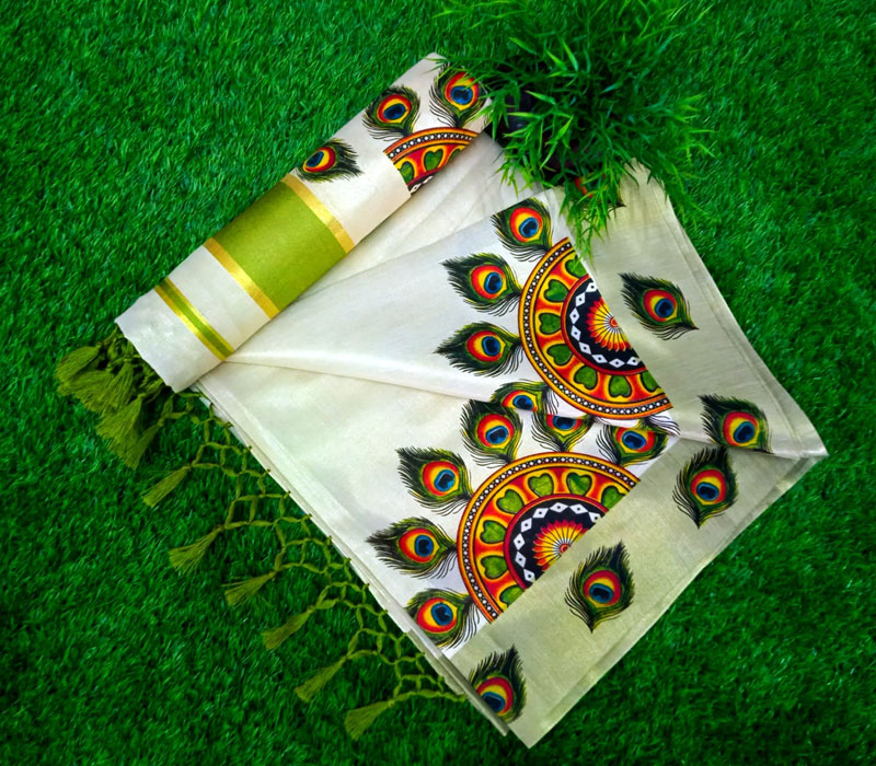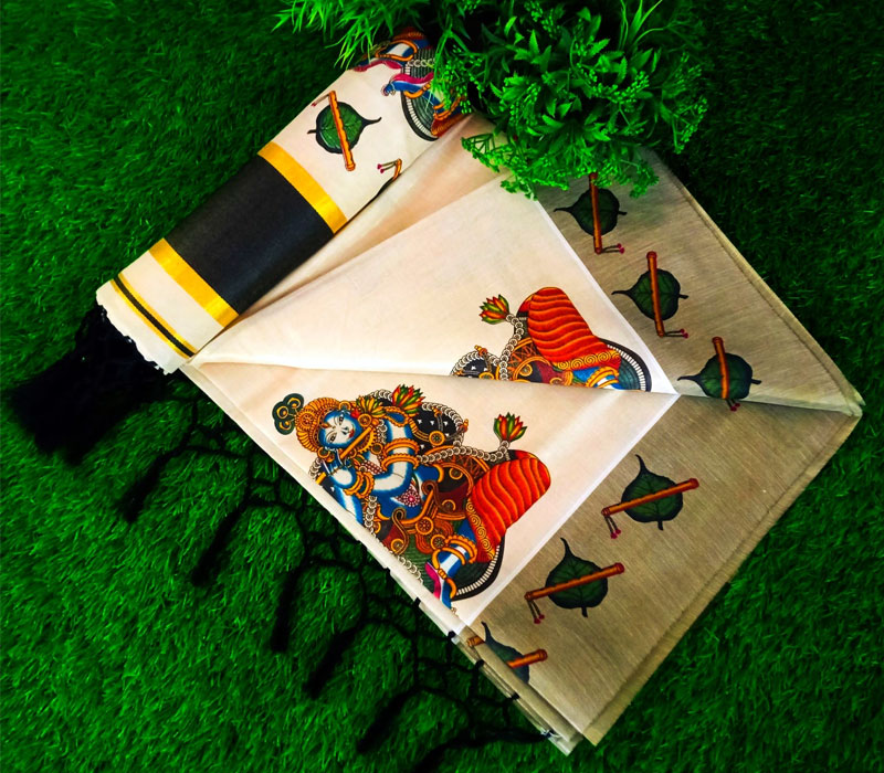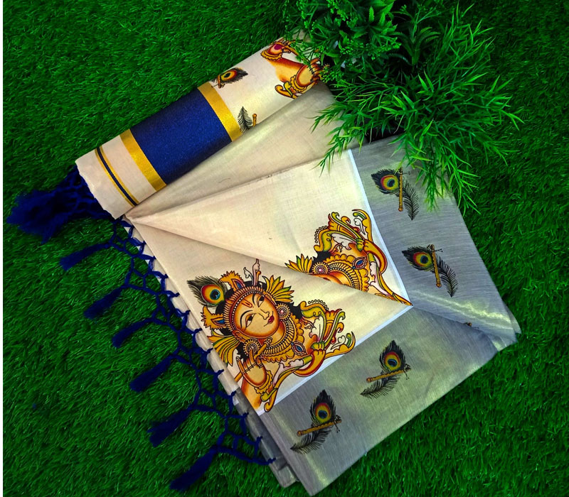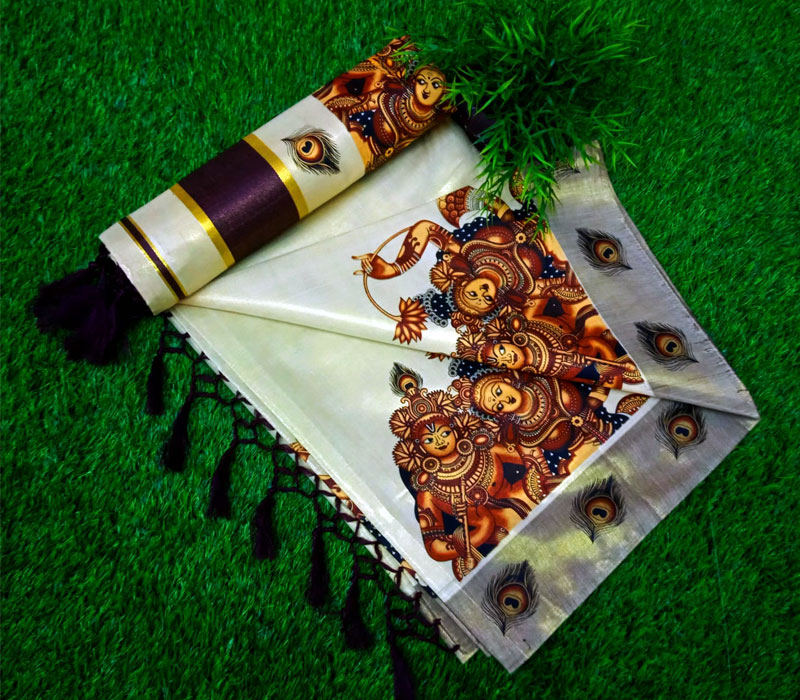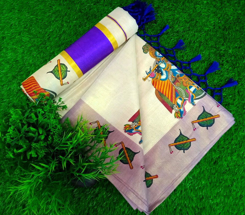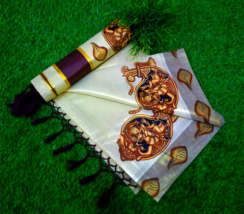 Golden tissue colour Kottaran saree with mural print and with handknot tussle work, Smooth and shiny finish. Saree length:- 6.25 mtr with running blouse