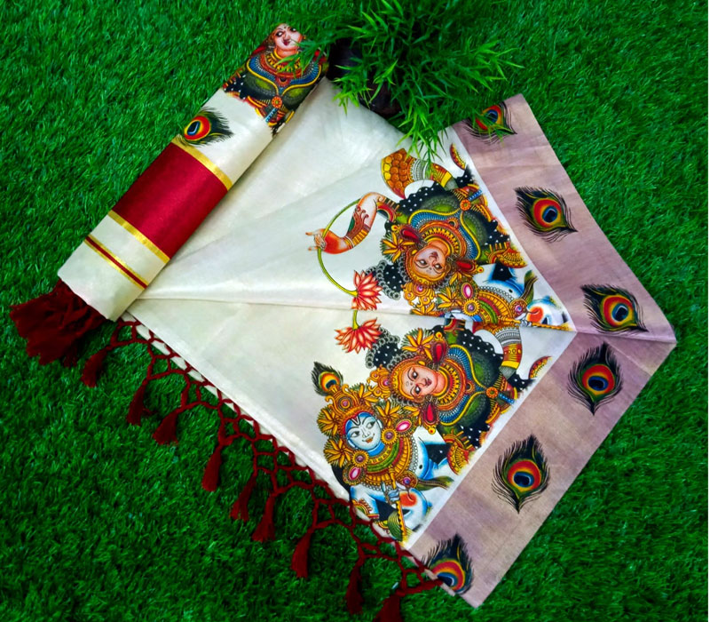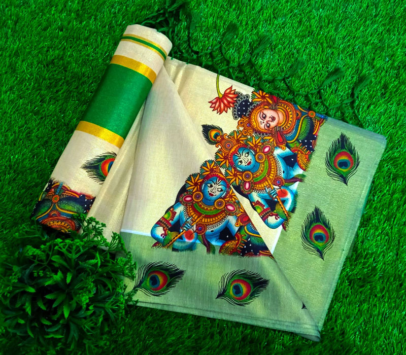 Golden tissue colour Kottaran saree with mural print and with handknot tussle work, Smooth and shiny finish. Saree length:- 6.25 mtr with running blouse