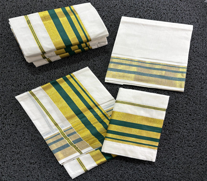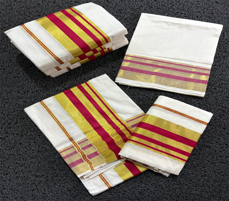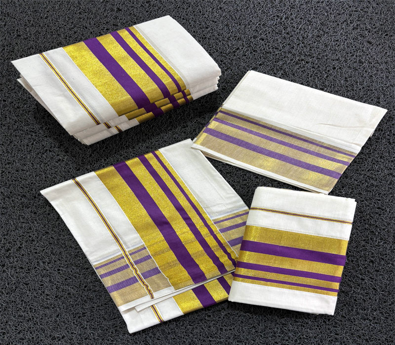 Premium quality dual tone border cotton setmund with golden highlite with blouse. Length: 2.80 x 2mt.