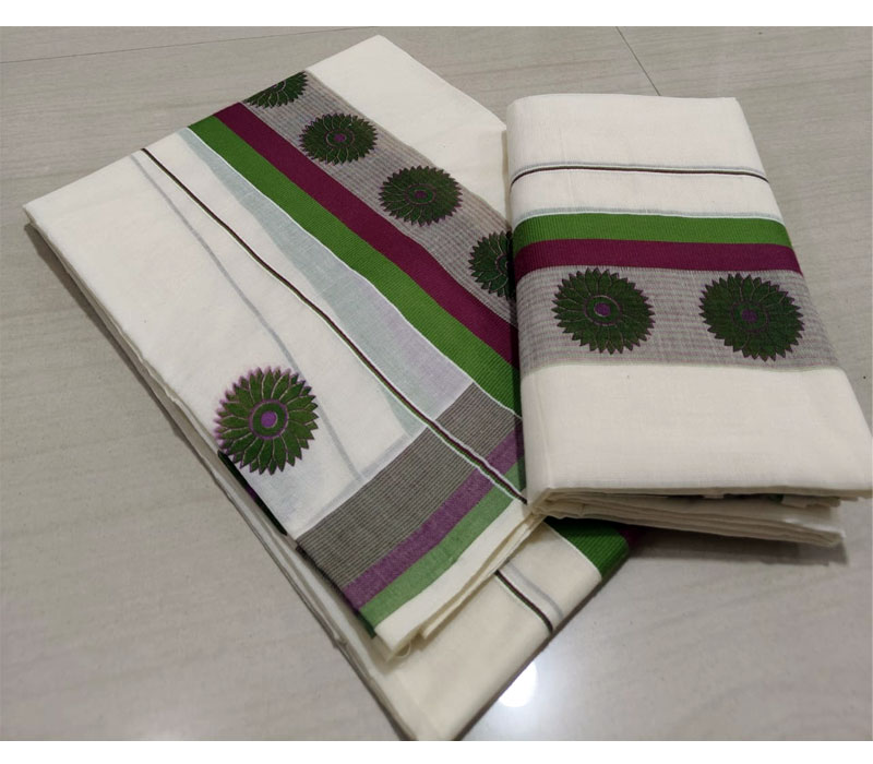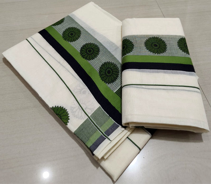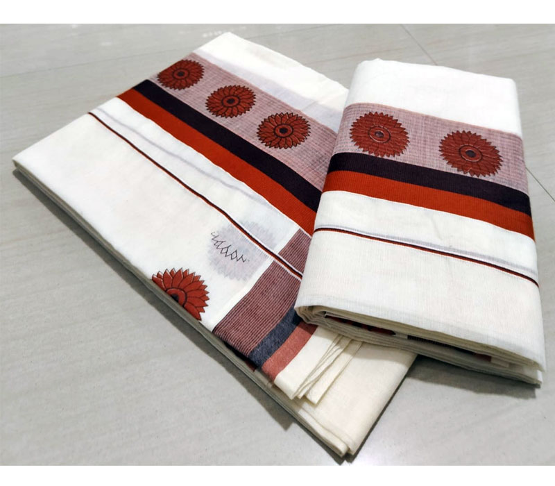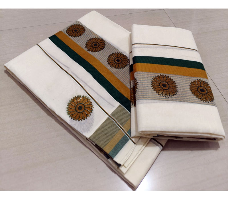 Kerala traditional pure cotton set mundu with sunflower printed design from Kuthampully. Length. 2.80