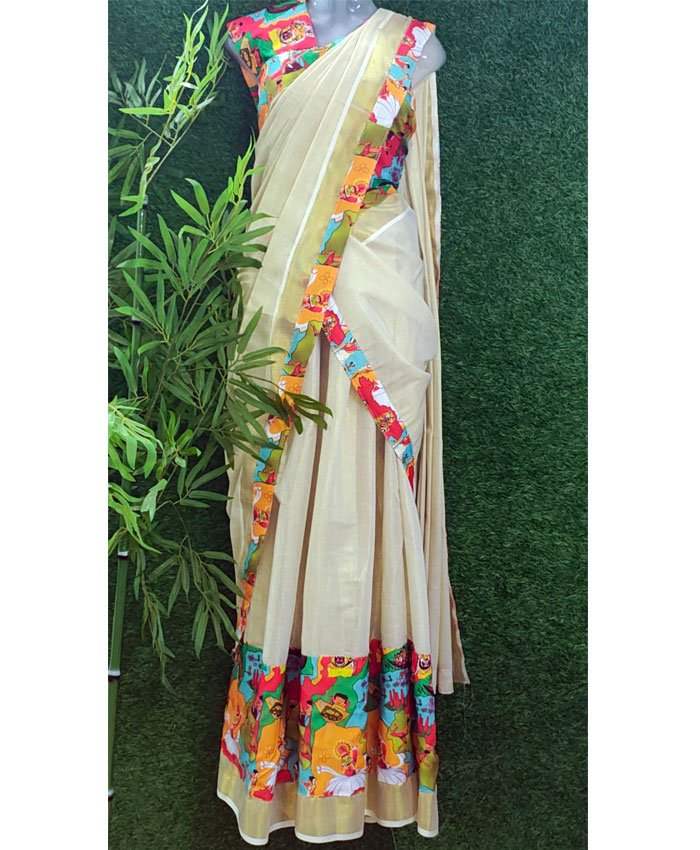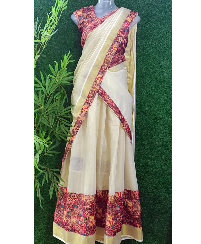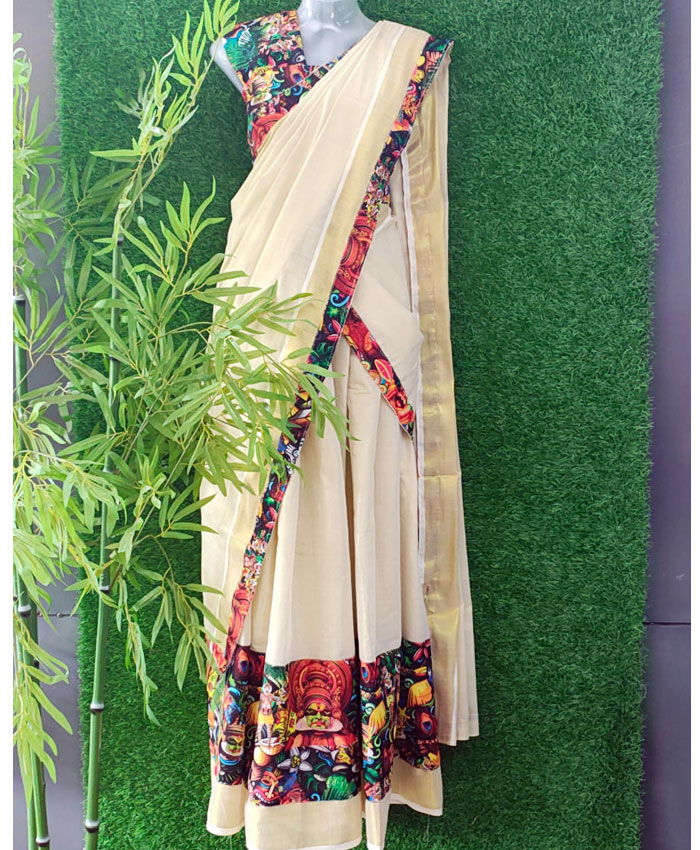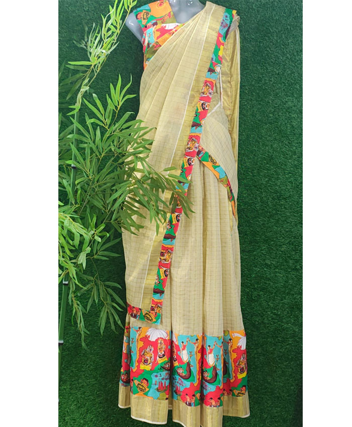 Step into the festive spirit of Onam with our exquisite Digital Print Tissue Dhavani Set! This stunning ensemble is crafted from luxurious tissue fabric, offering a delicate shimmer and a graceful drape that's perfect for the celebrations. The dhavani features a captivating digital print concept, bringing vibrant artistry to life. The set is completed with a beautifully digital printed blouse and an additional matching patch, ensuring a perfectly coordinated and unique look. Embrace tradition with a modern twist this Onam!