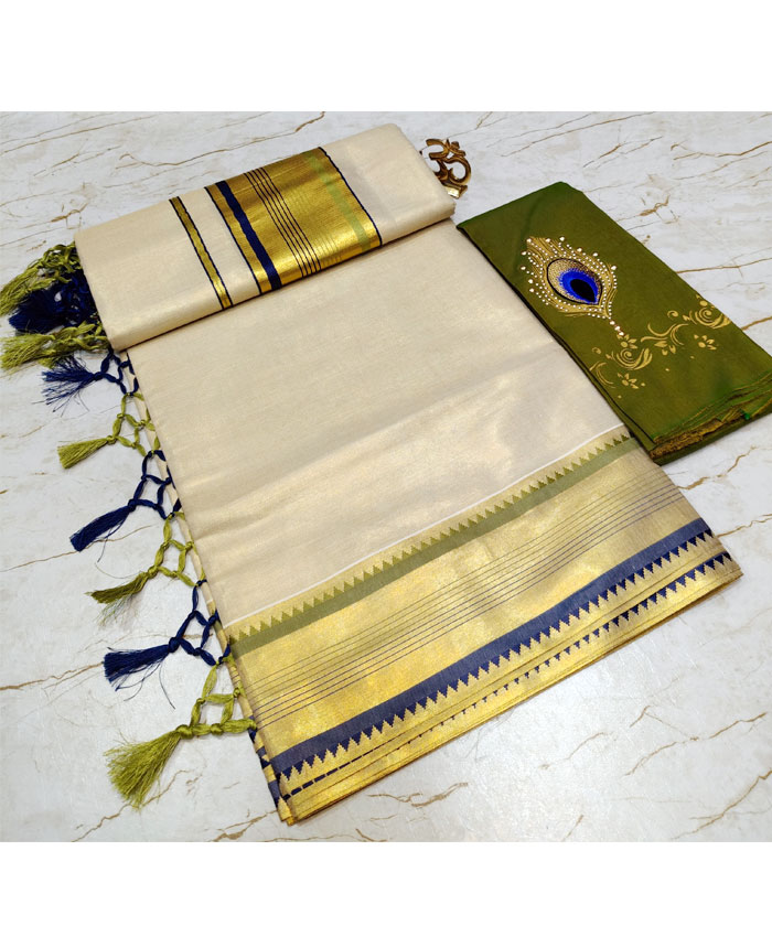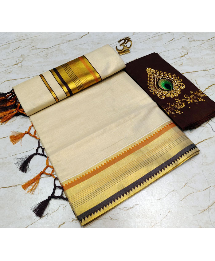 Step into a realm of unparalleled elegance with our Special Quality Golden Tissue Double Colour Temple Saree. This magnificent saree is a true masterpiece, meticulously crafted from luxurious golden tissue fabric that drapes with a divine shimmer. The unique double colour weave creates a captivating interplay of hues, making it truly distinctive. Adorned with a fancy Kunjalam (tassel/motif) design and a rich, traditional border, this saree embodies the grandeur of classic temple artistry. Perfect for weddings, grand festivities, religious ceremonies, and any occasion where you desire to make a truly unforgettable and auspicious statement.