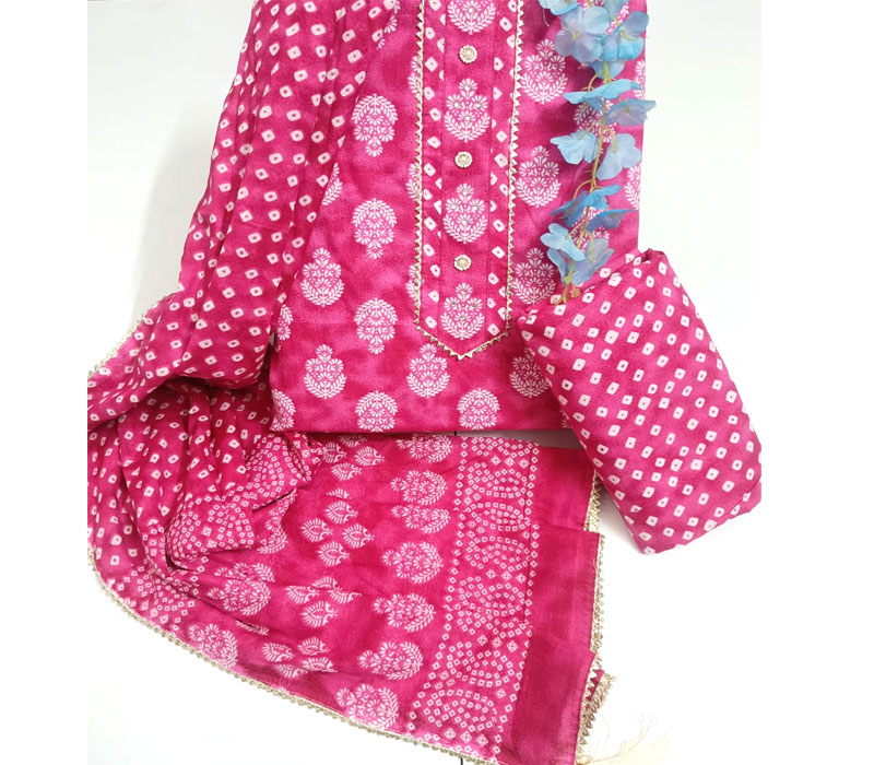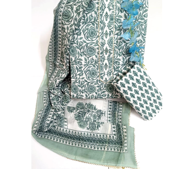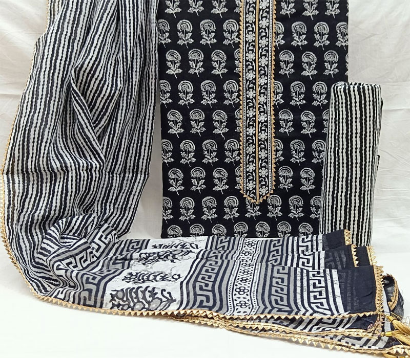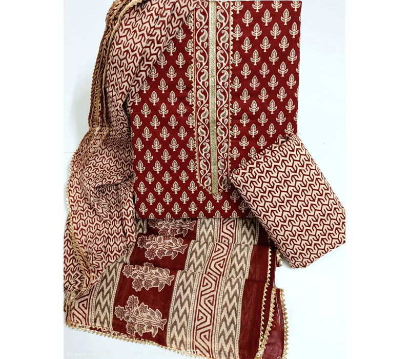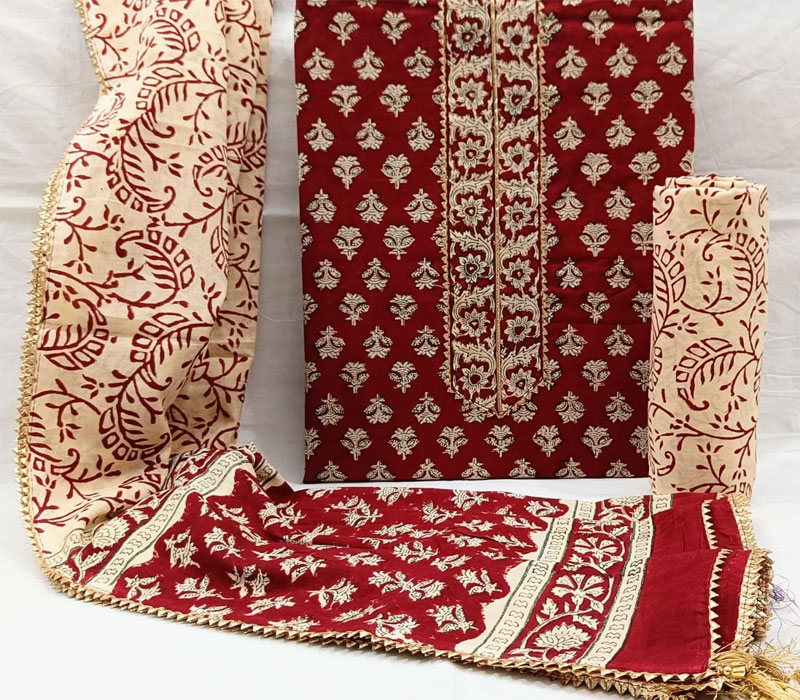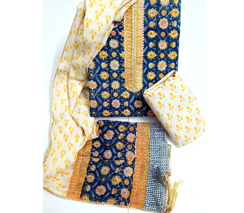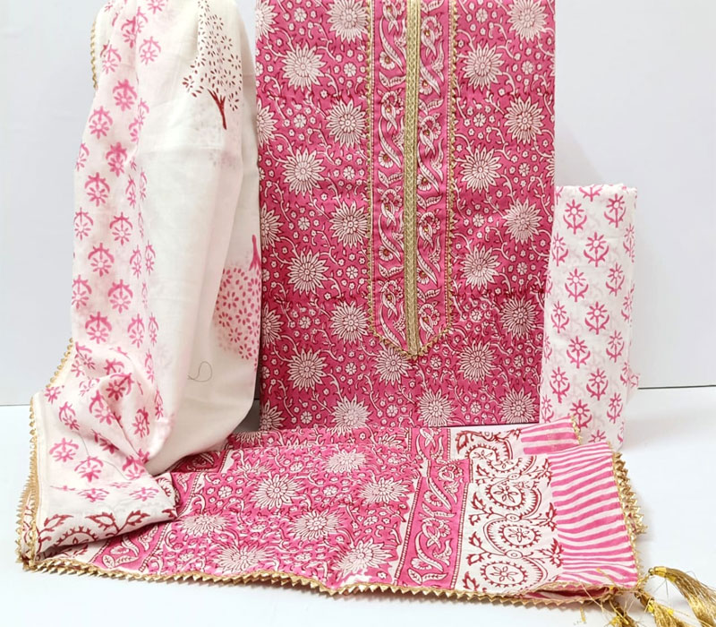 Sanganeri print cotton suit material with cotton dupatta. Gotta tye neck work. Top cotton 2.5m. Bottom cotton 2.5m. Duppta cotton 2.5 m.